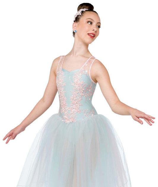 23034Y Belle – Purple Scroll Sequin Ballet Costume with Ribbon Bodice and Organza Sleeves