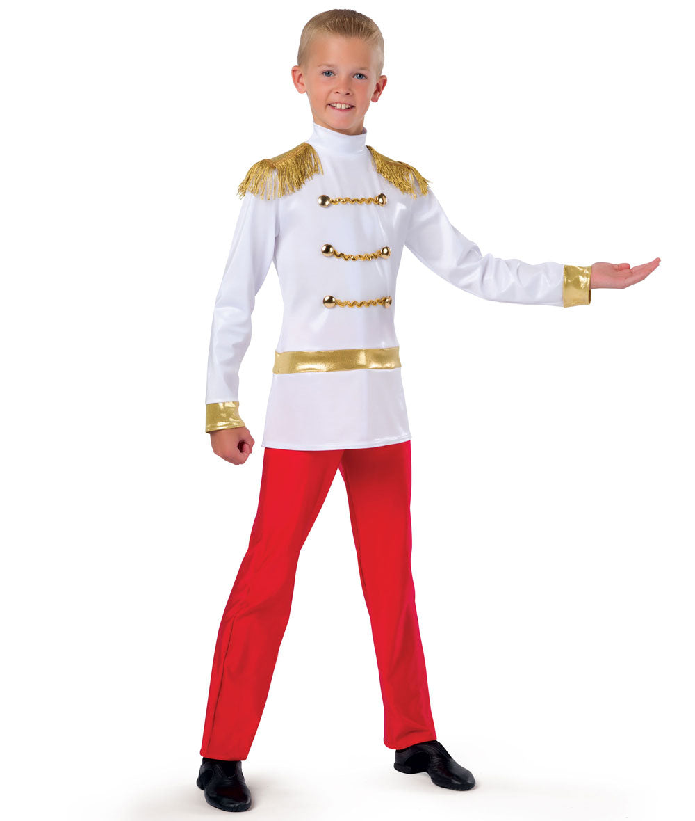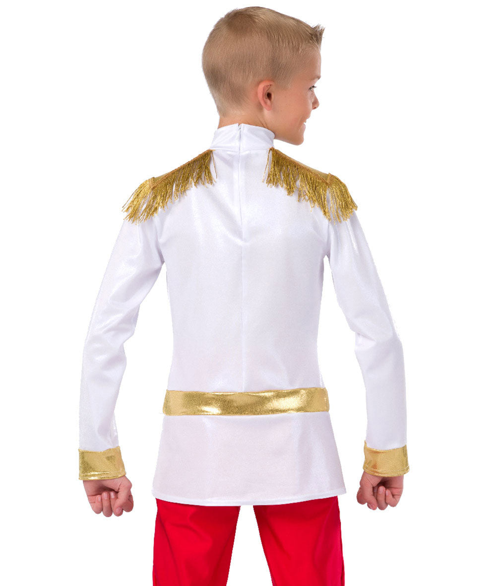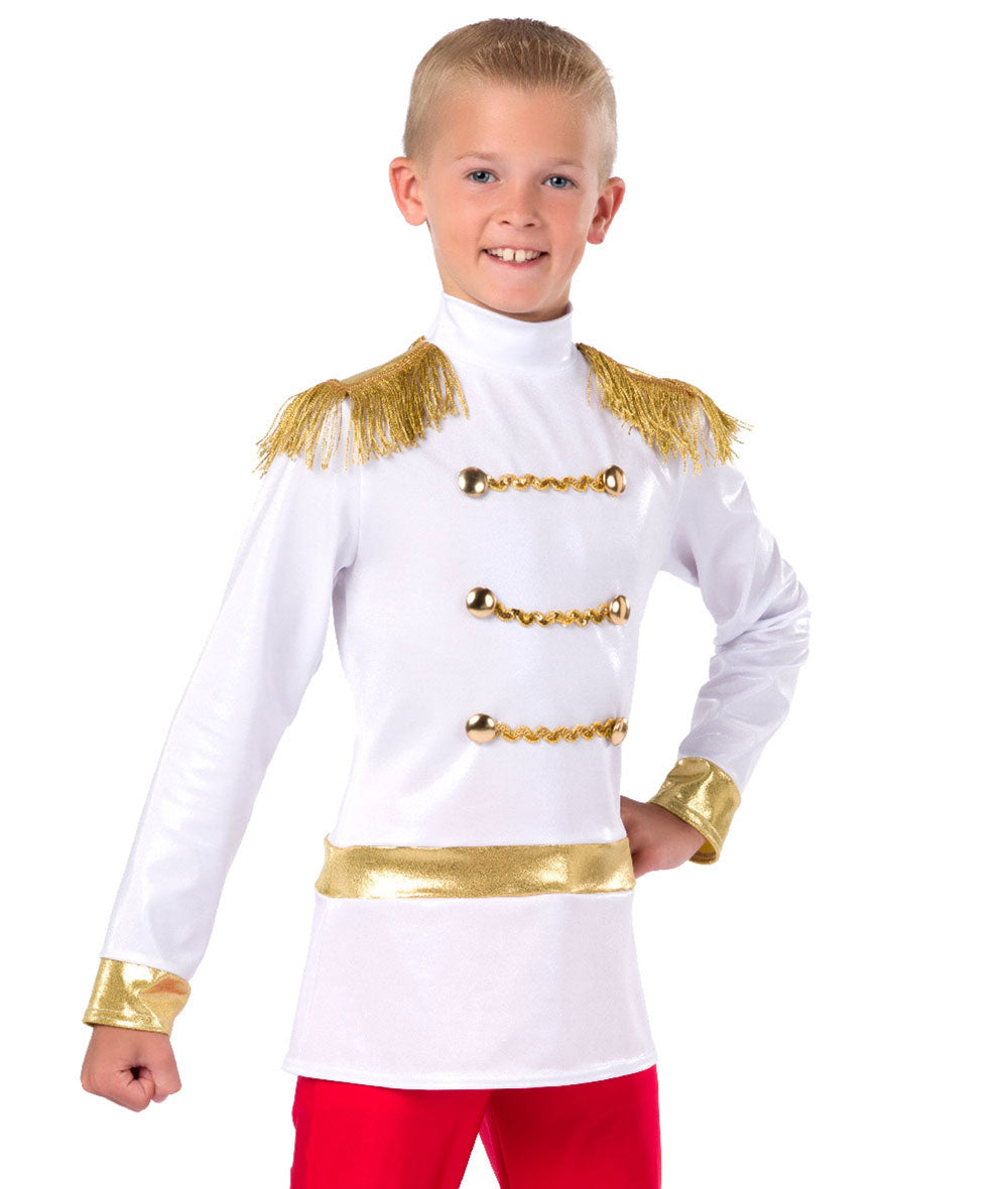Foil lycra shirt with zipper back. Attached tack buttons, sequin trim, fringe epaulettes and foil lycra insets. Made in the USA.