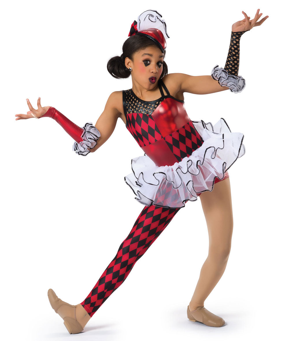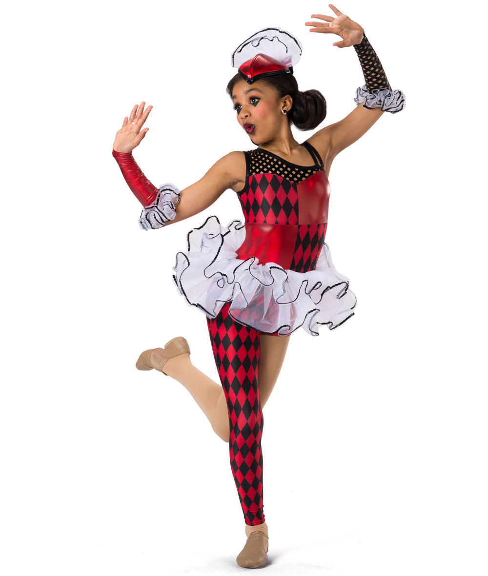 Print spandex and flat foil lycra one-legged unitard with laser cut foil spandex over mesh inset. Attached sequin trimmed organza tutu. Made in the USA.