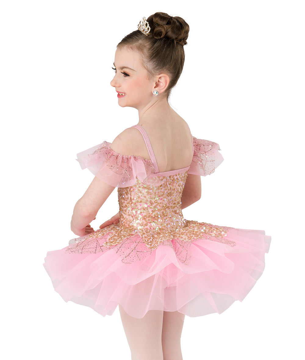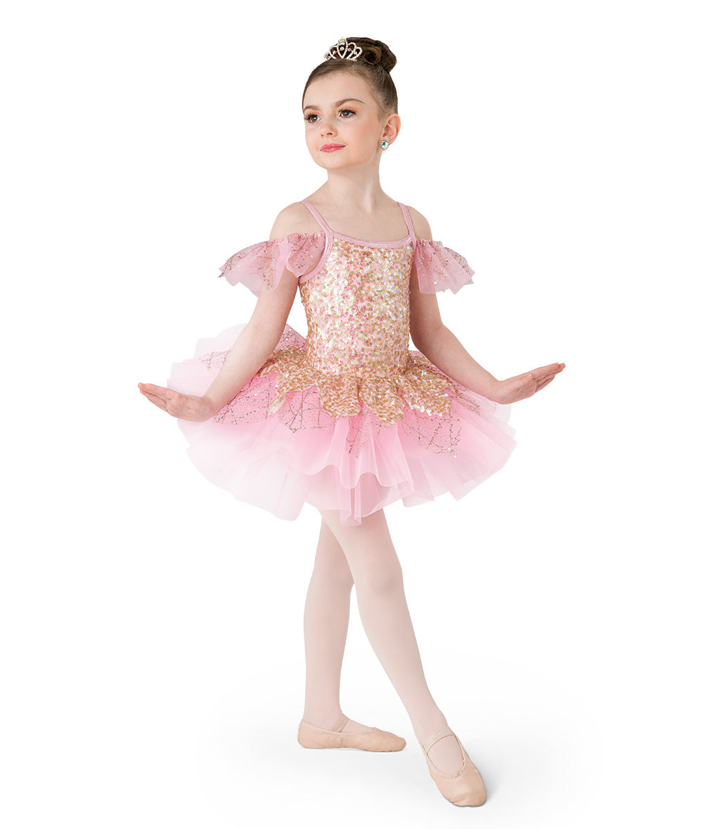Lined glitter sequin mesh and spandex leotard with embroidered glitter sequin tulle topskirt and sleeves. Attached organza short tutu. Made in the USA.