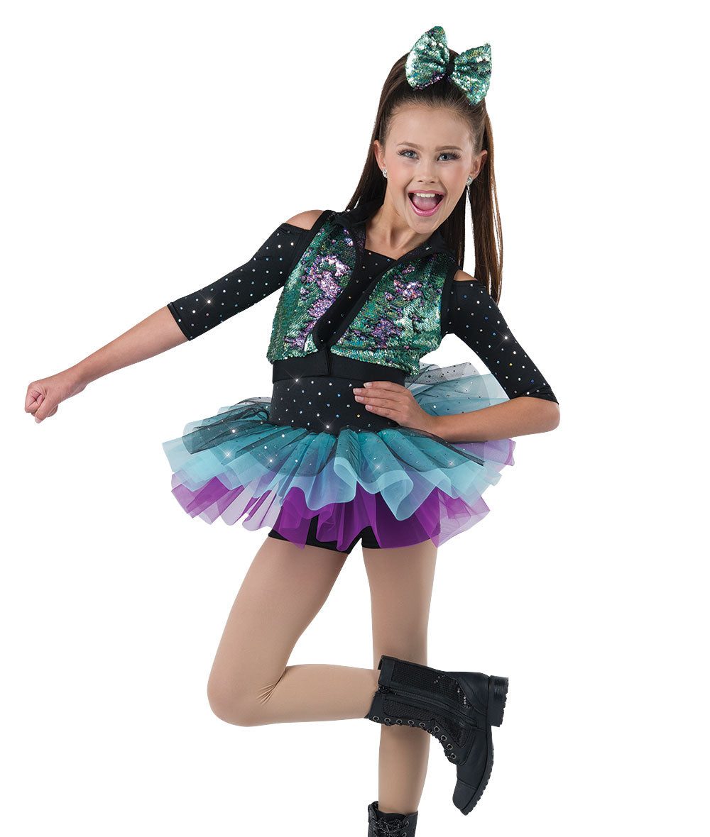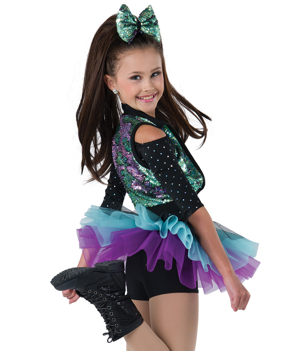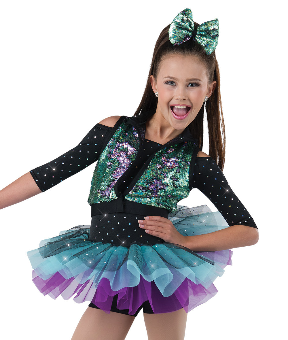 Sequin dot and solid spandex shortall with attached sequin tulle and organza tutu. Hologram flip sequin mesh vest with spandex trim and velcro closure. Imported.
