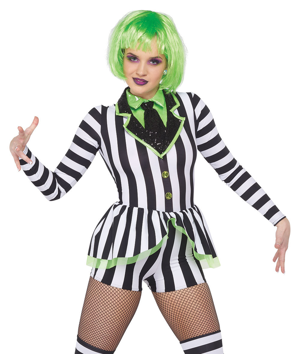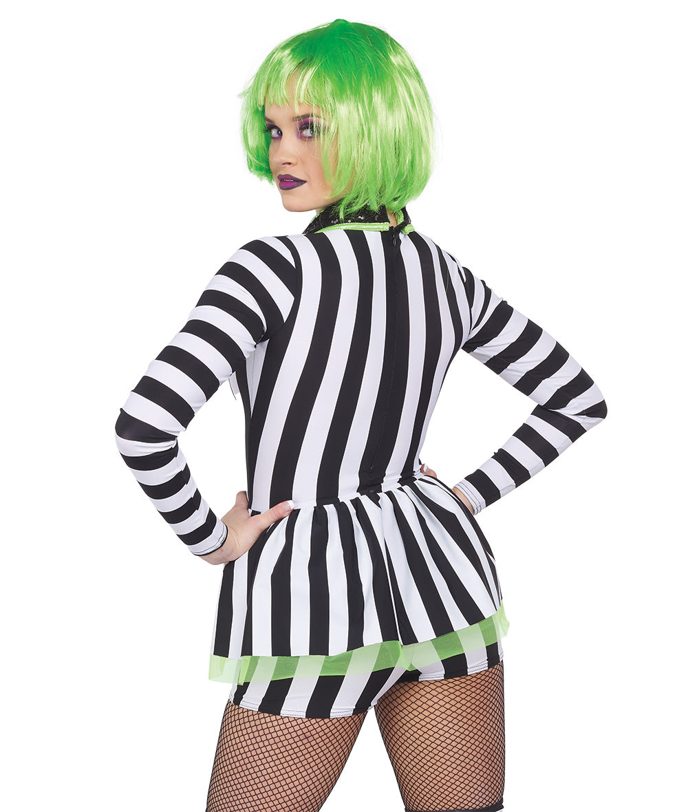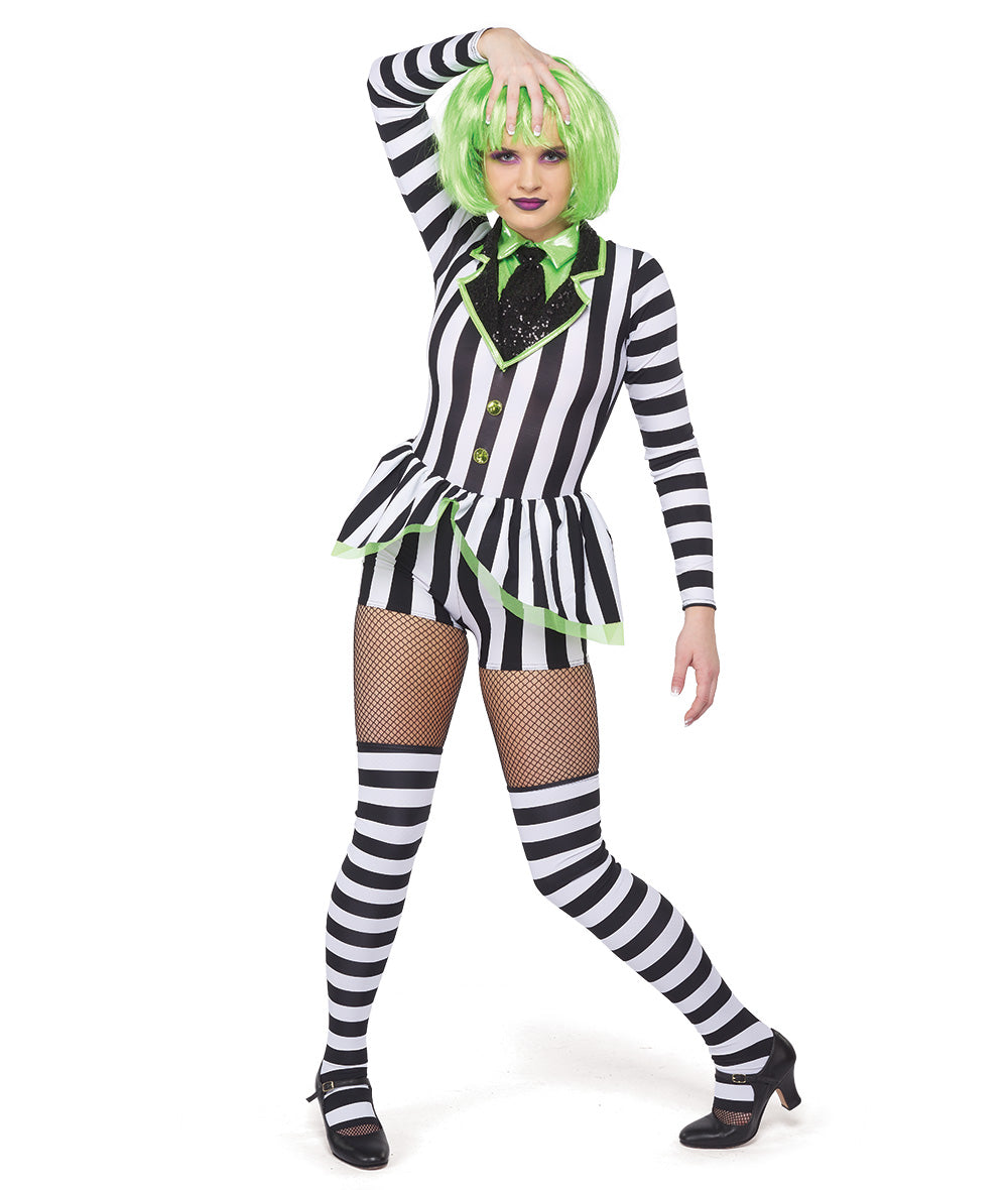 Striped spandex long sleeve shortall with organza peplum and sequin buttons. Foil lycra shirt front with sequin spandex tie and collar. Zipper back and lined shorts. Socks sold separately. Made in the USA