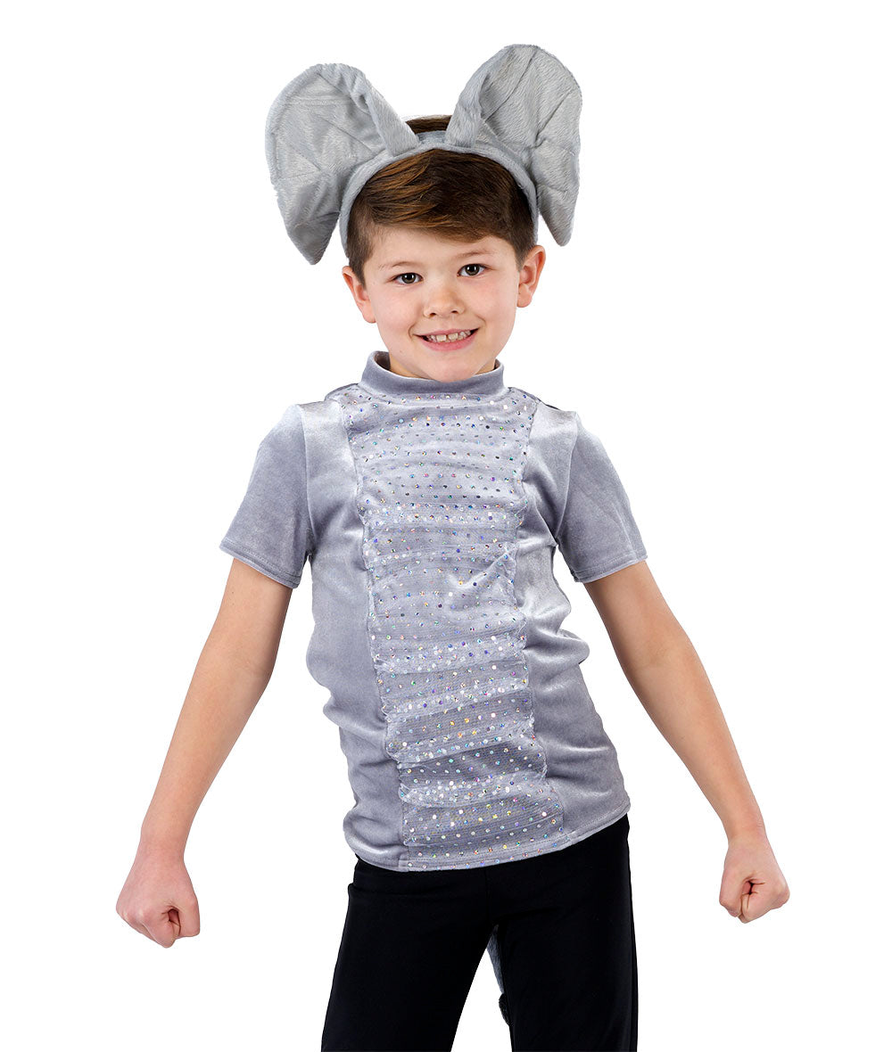 Sequin dot tulle and solid velvet top with mock collar. Attached elephant tail. Pants sold separately. Made in the USA.