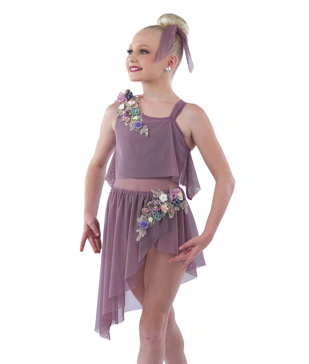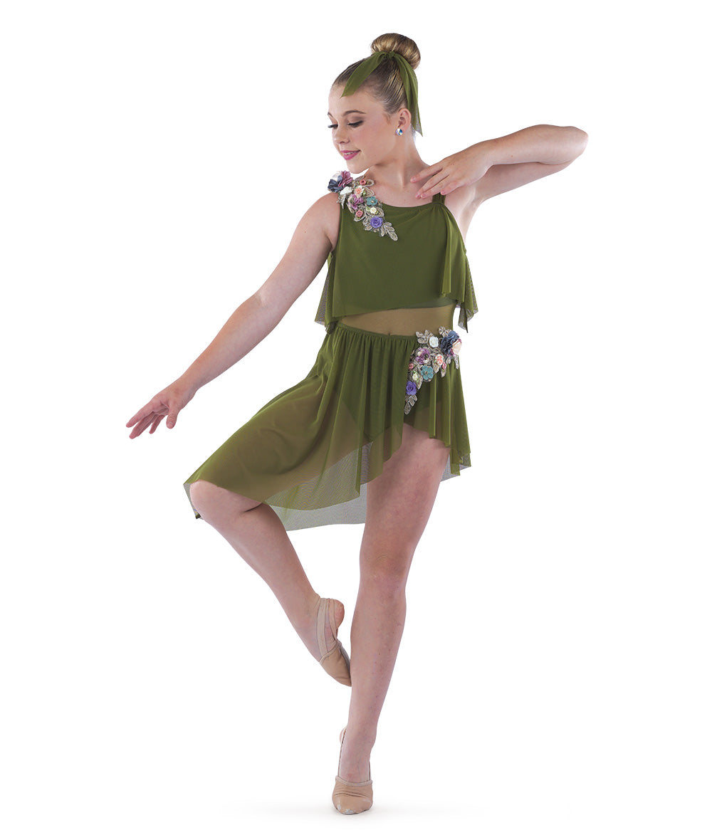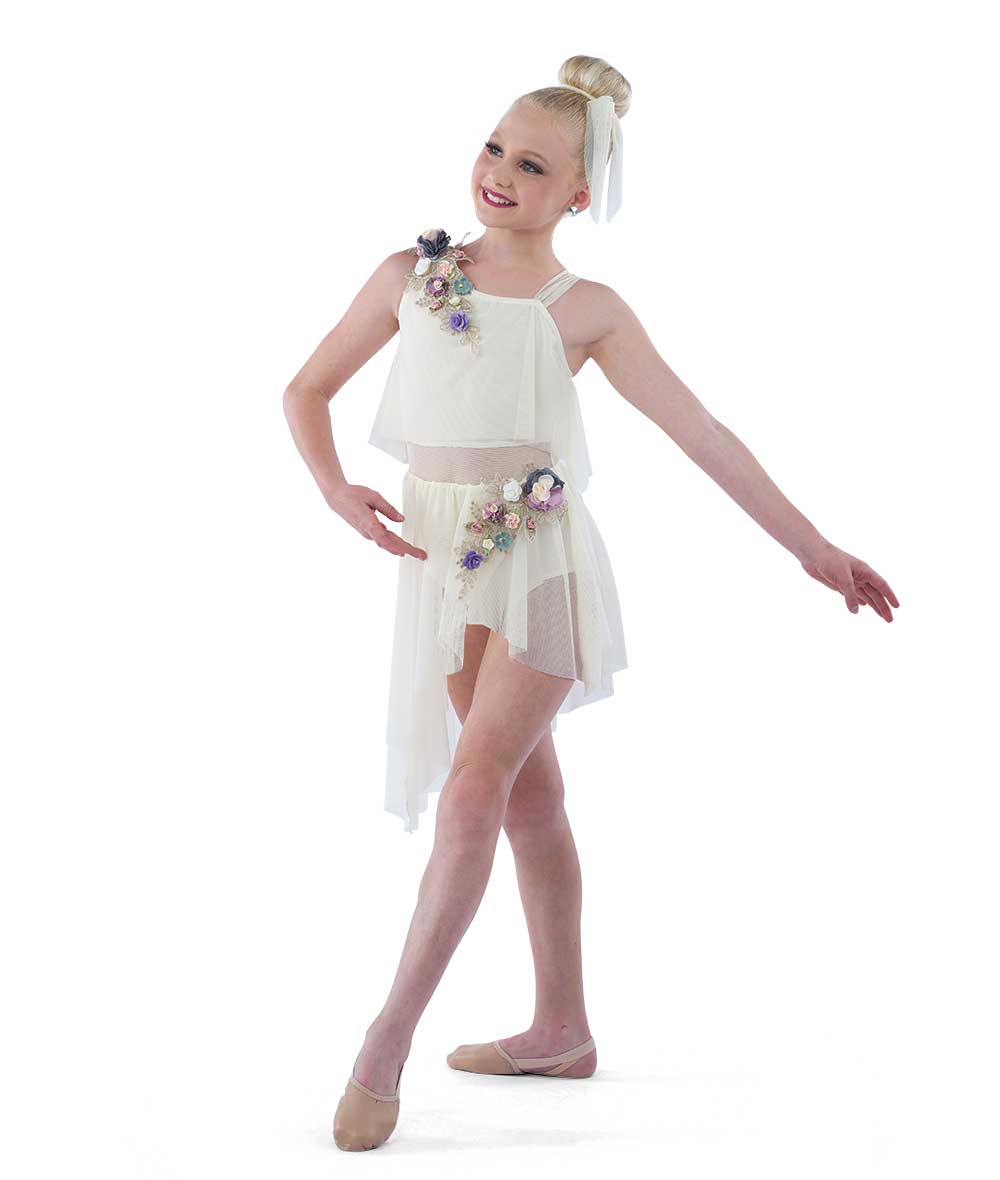 Spandex and mesh dress with asymmetrical skirt over attached leotard. Attached floral appliques. Made in the USA.