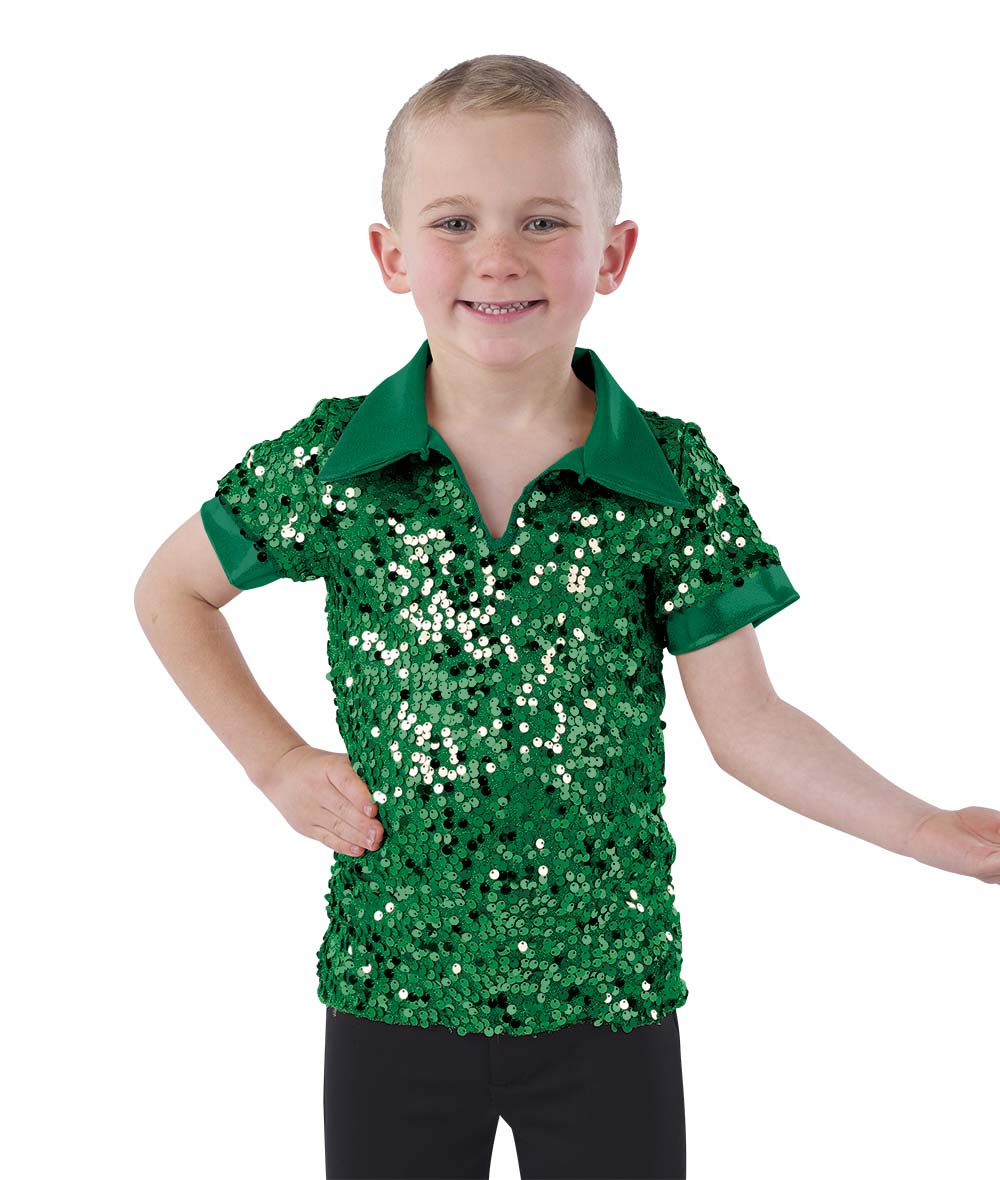Let your young performer shine on stage with the 21862 Sequin Boy Shirt from A Wish Come True. This high-energy boys’ dance shirt features lined gold paillette sequins layered over stretch spandex for a comfortable fit and dazzling sparkle. The shiny foil lycra collar adds a touch of sophistication, making it perfect for jazz routines, tap numbers, holiday recitals, or musical theatre.