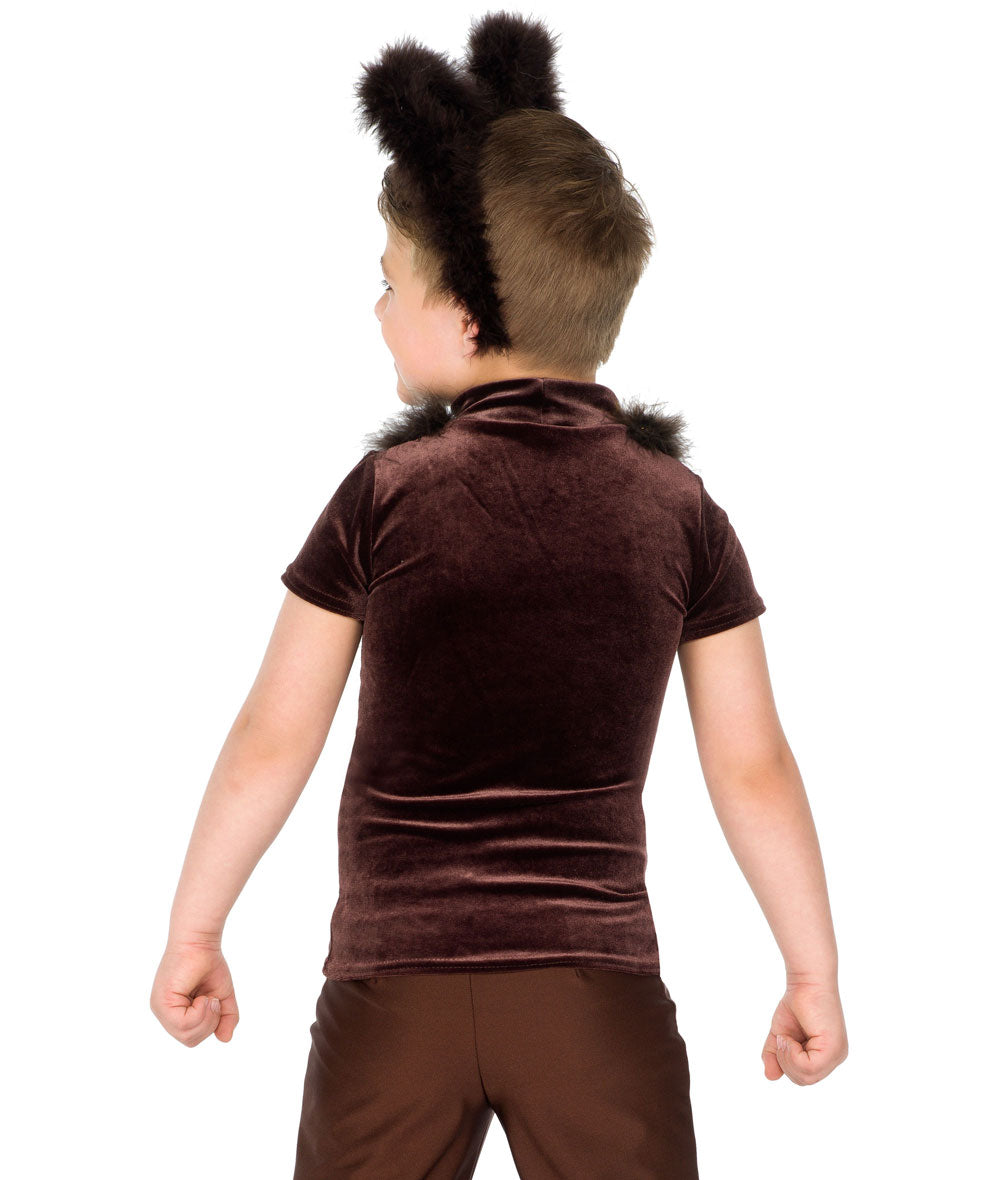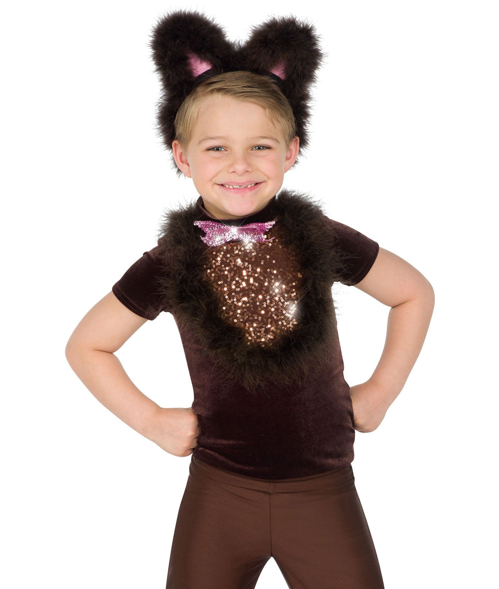 Velvet top with lined sequin spandex inset, marabou trim and attached sequin bow tie. Pants sold separately. Made in the USA.