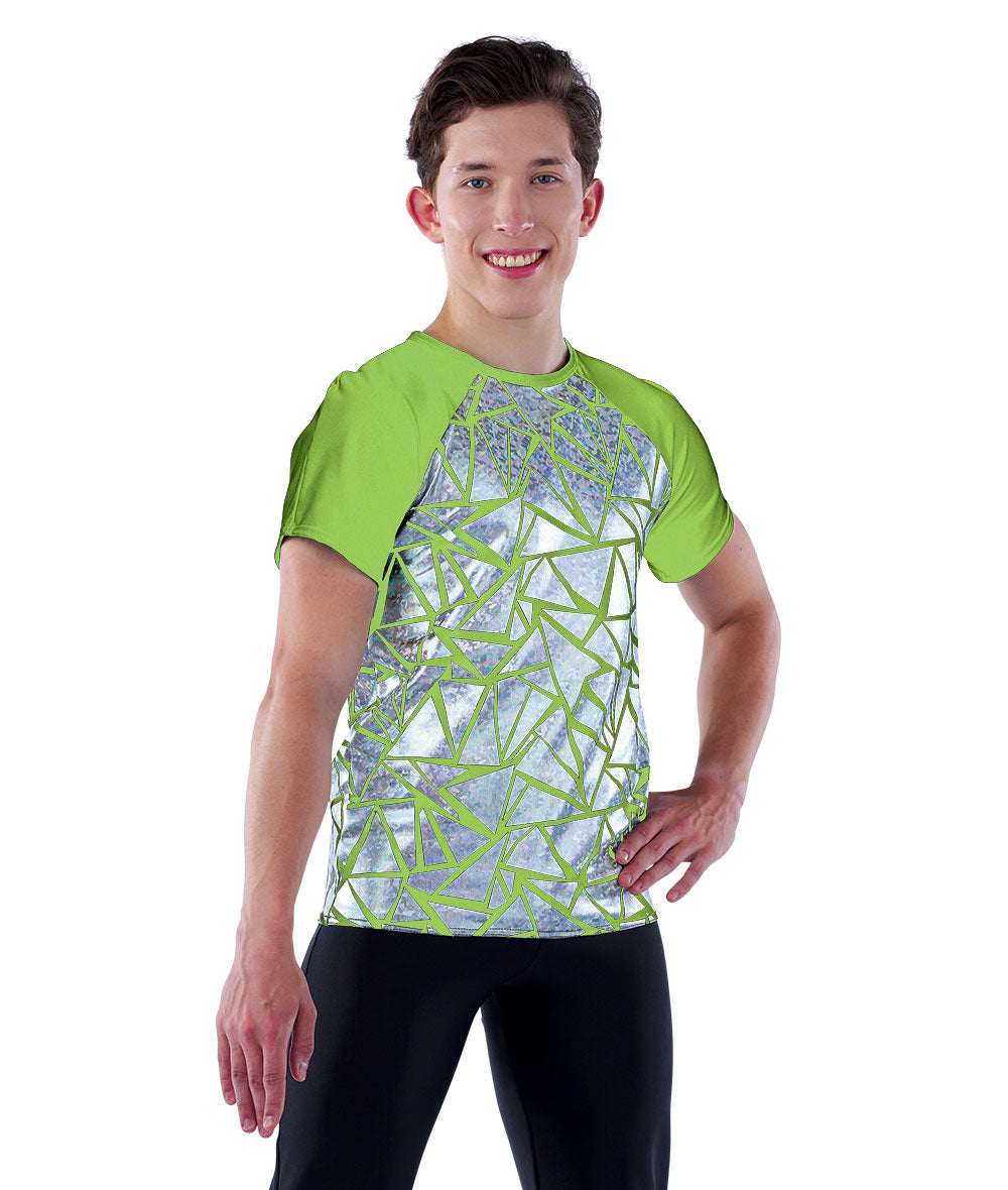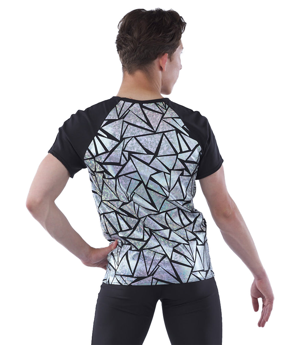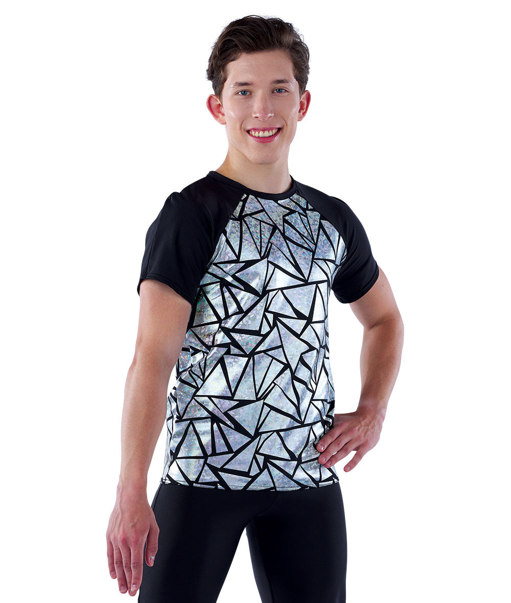 Geometric foil and solid spandex short sleeve top. Pants sold separately. Made in the USA.