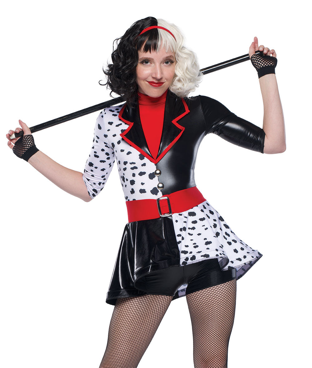Flat foil lycra and Dalmatian print spandex high-low jacket with horsehair trim over attached hot pants. Attached tack buttons and buckle. Zipper back. Made in the USA.