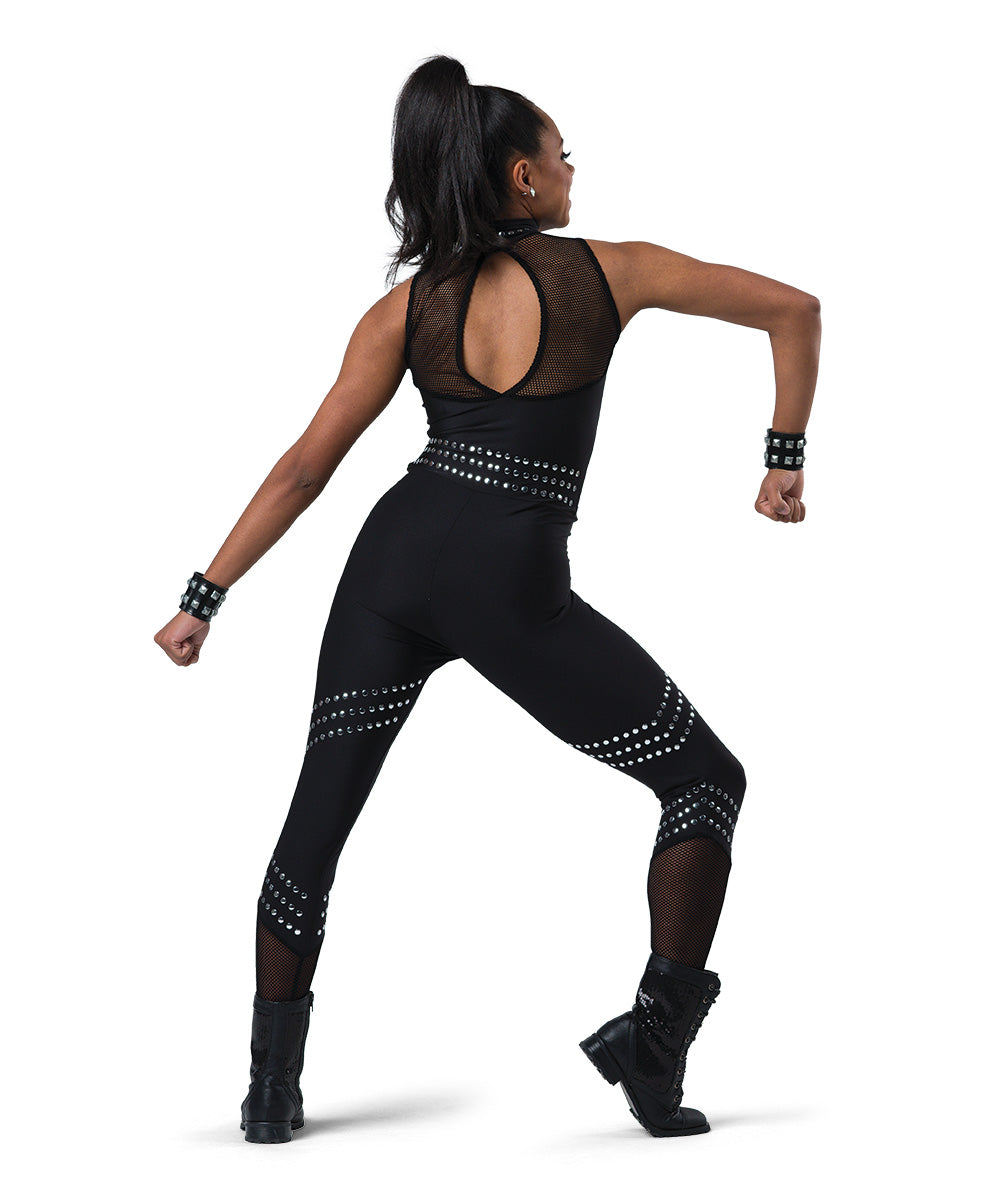Spandex unitard with fishnet insets and attached studs. Accessories sold separately. Imported.