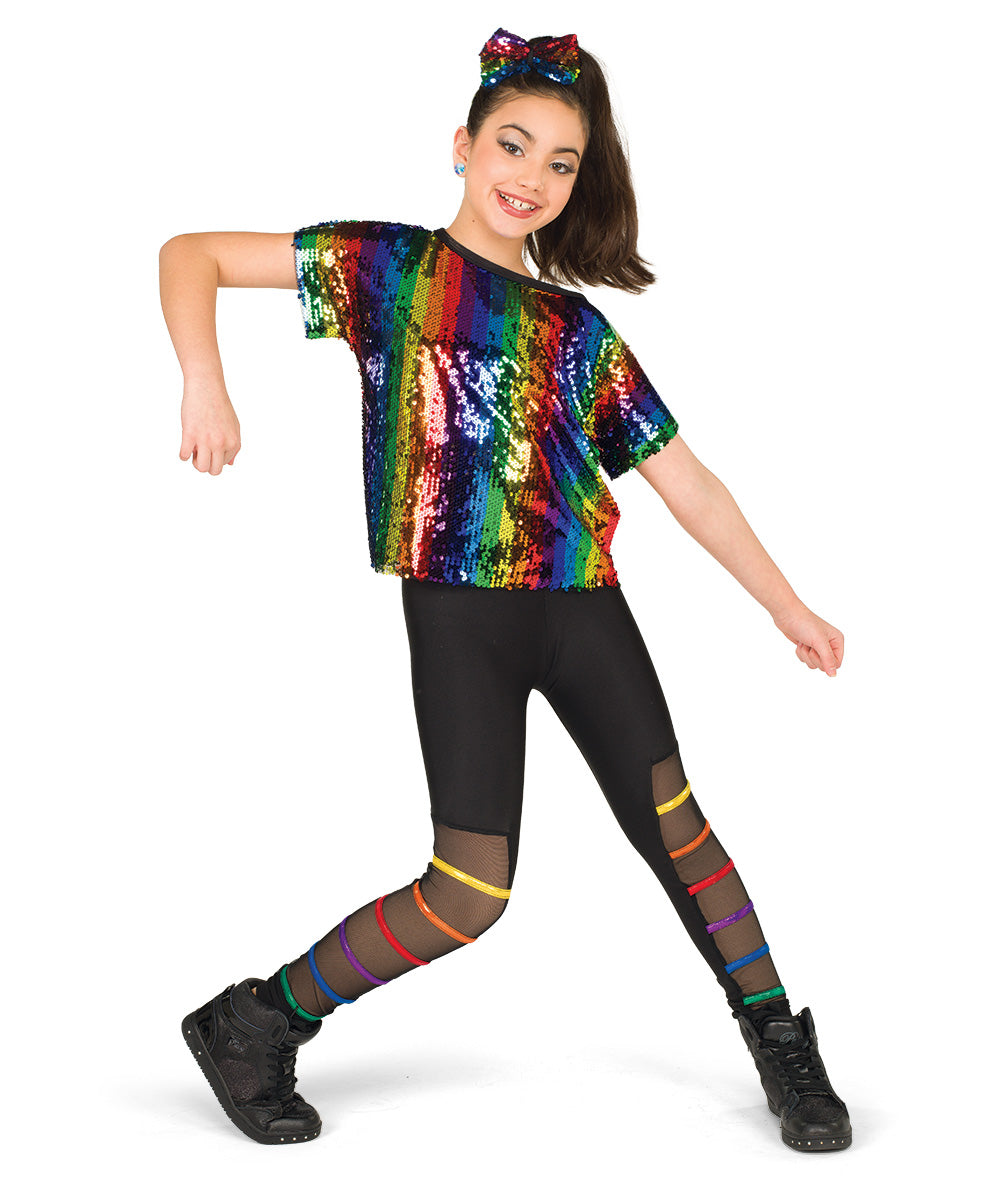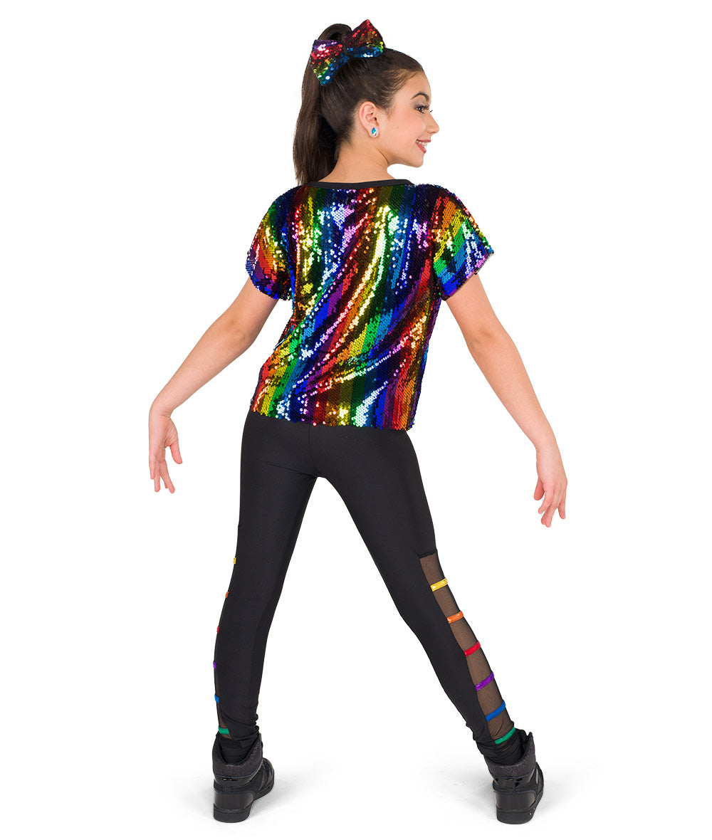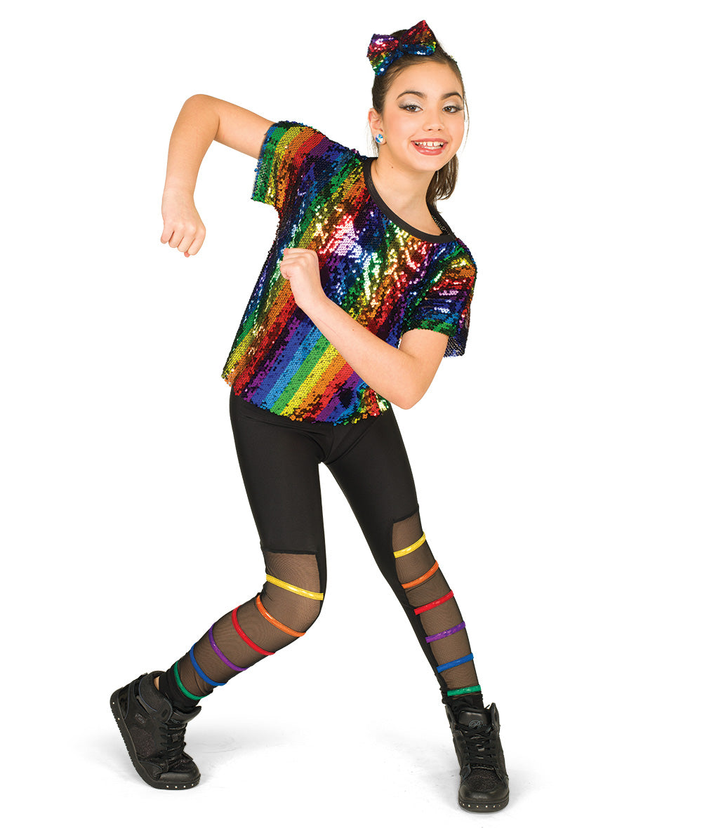 Rainbow striped crop top over separate spandex bra top. Spandex high-waisted leggings with mesh inset and rainbow foil lycra accents. Imported.