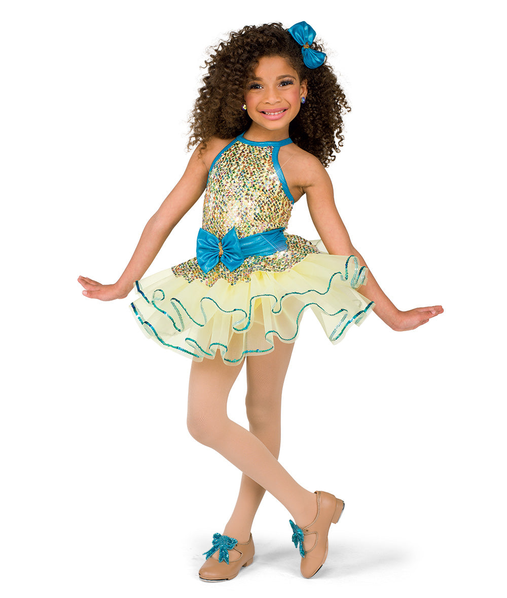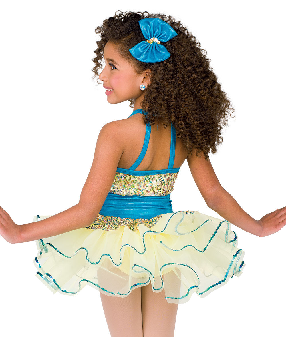 Lined multicolor sequin mesh and foil lycra bodice and topskirt with attached bow. Attached sequin trimmed organza tutu over spandex leotard. Shoe bows sold separately. Made in the USA.
