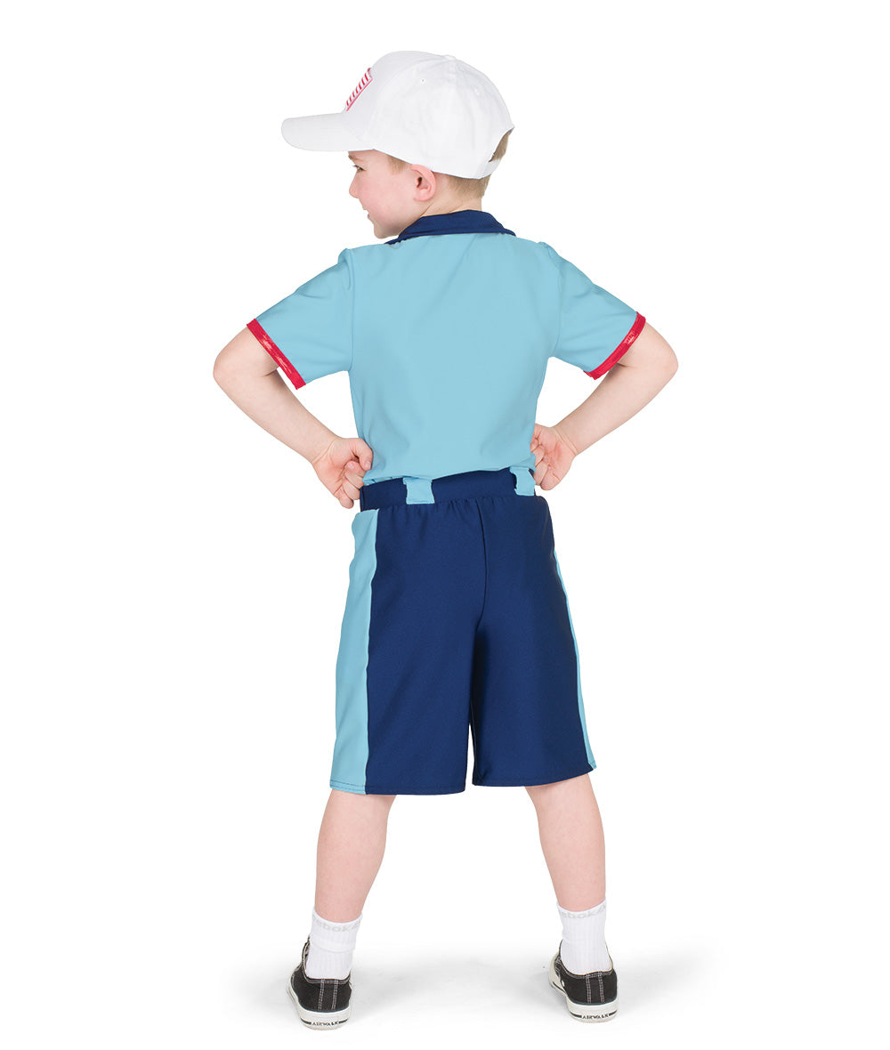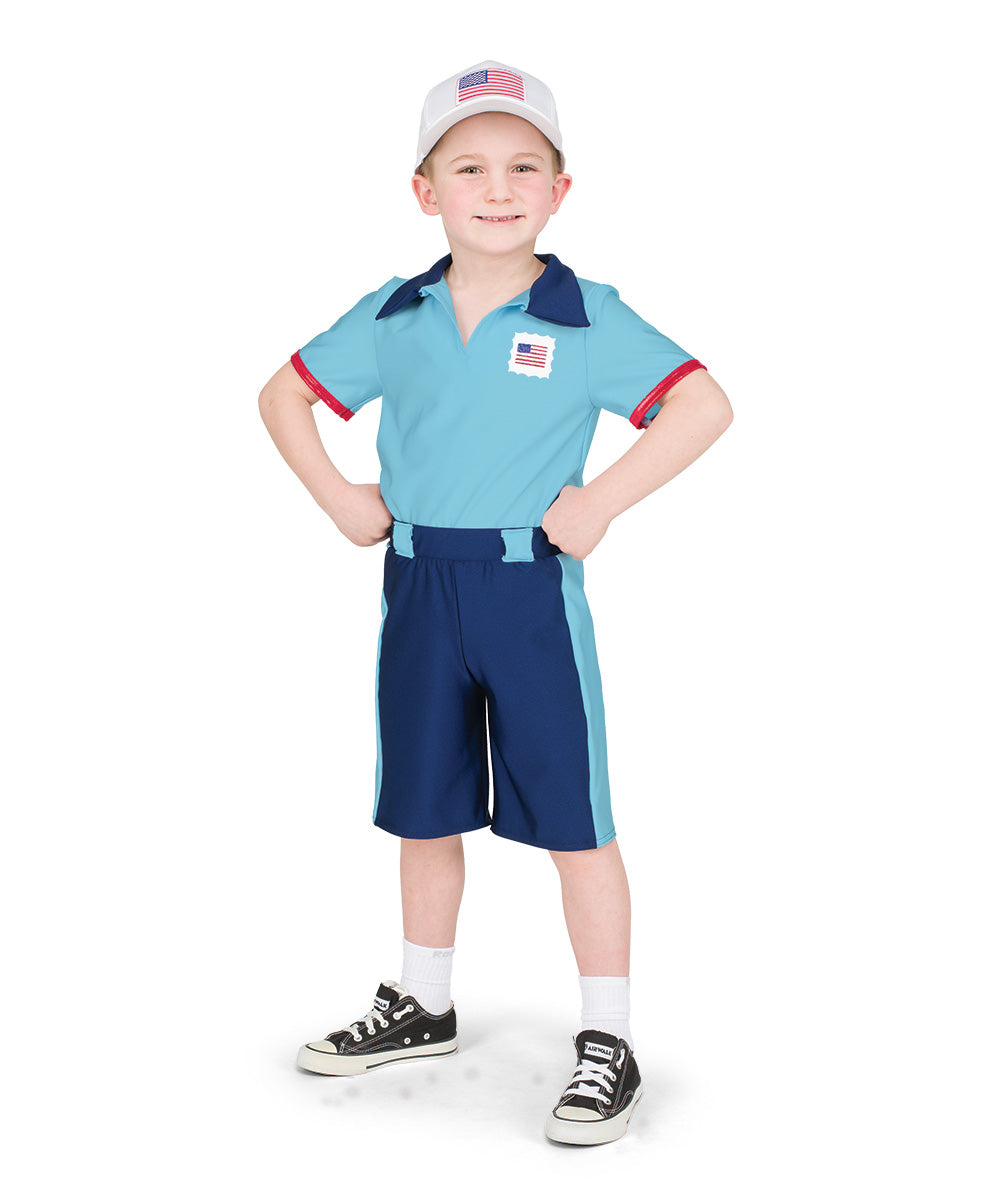 Spandex collared shirt with attached applique. Spandex long shorts. Hat and satchel sold separately. Made in the USA.