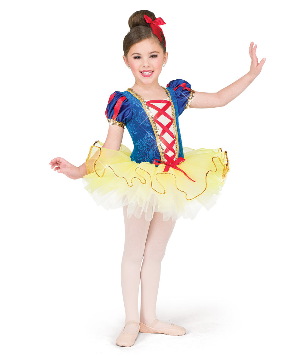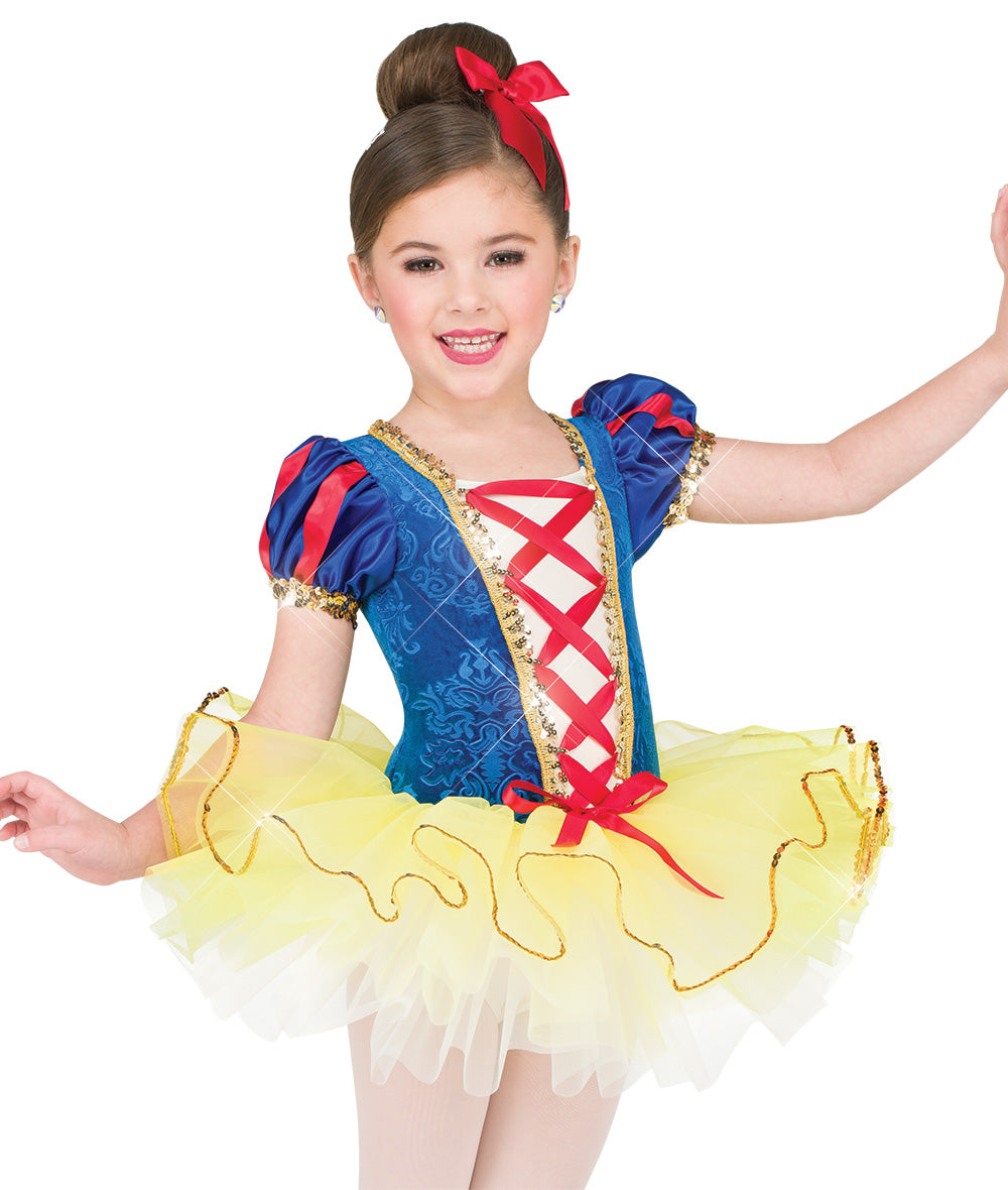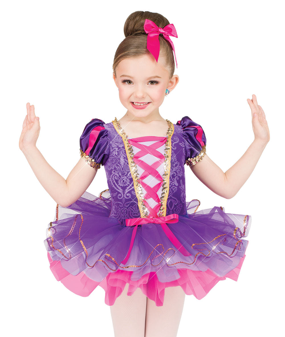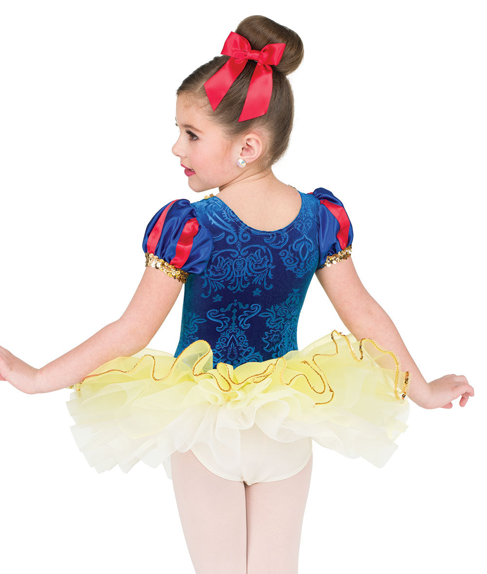 Embossed velvet and spandex leotard with satin sleeves and attached sequin trimmed organza tutu. Sequin trim and ribbon lace-up front. Made in the USA.