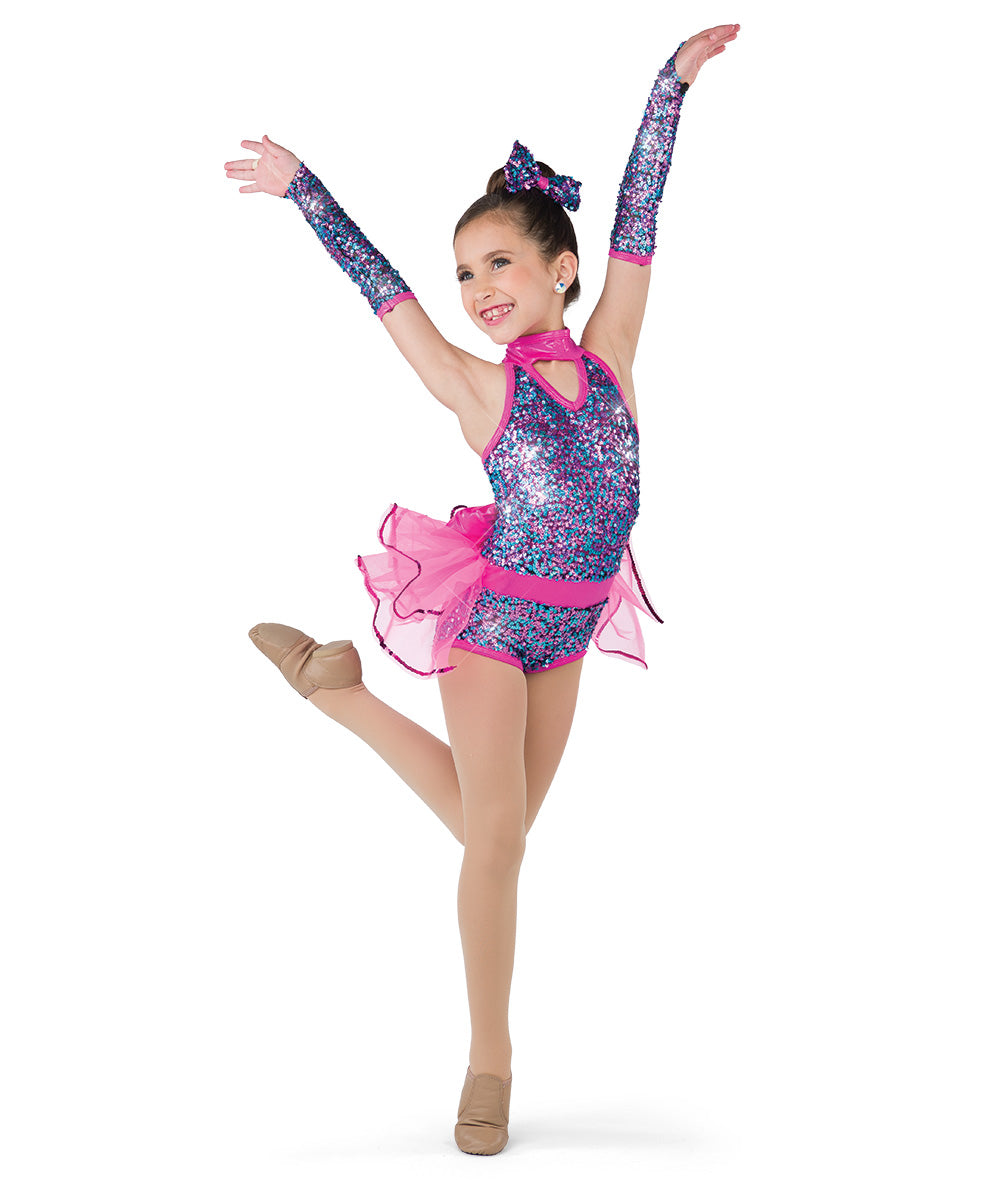 Lined multicolor luxe sequin mesh and foil lycra leotard. Attached bow and sequin trimmed organza back bustle. Mitts sold separately. Made in the USA.