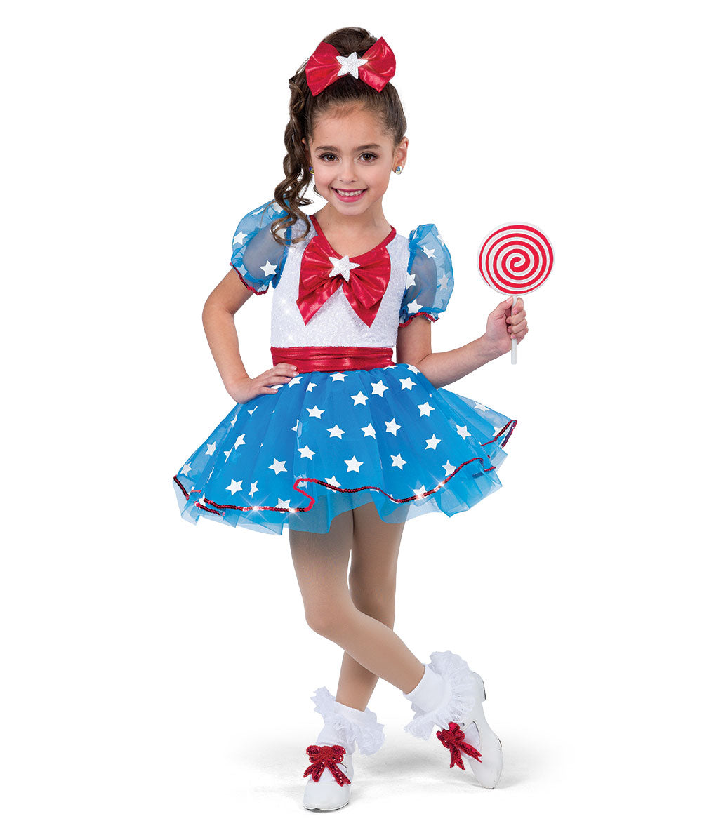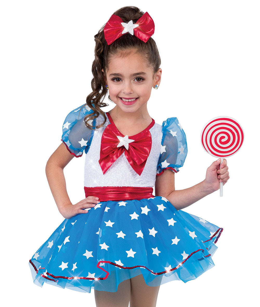 Lined sequin and solid spandex leotard with sequin trimmed star print organza elastic sleeves and topskirt. Attached flat foil lycra bow, waistband and organza tutu. Socks and shoe bows sold separately. Imported.