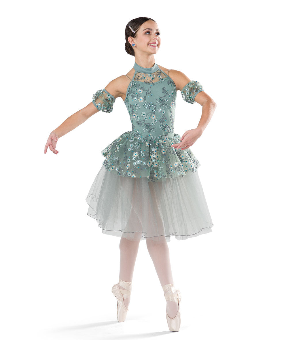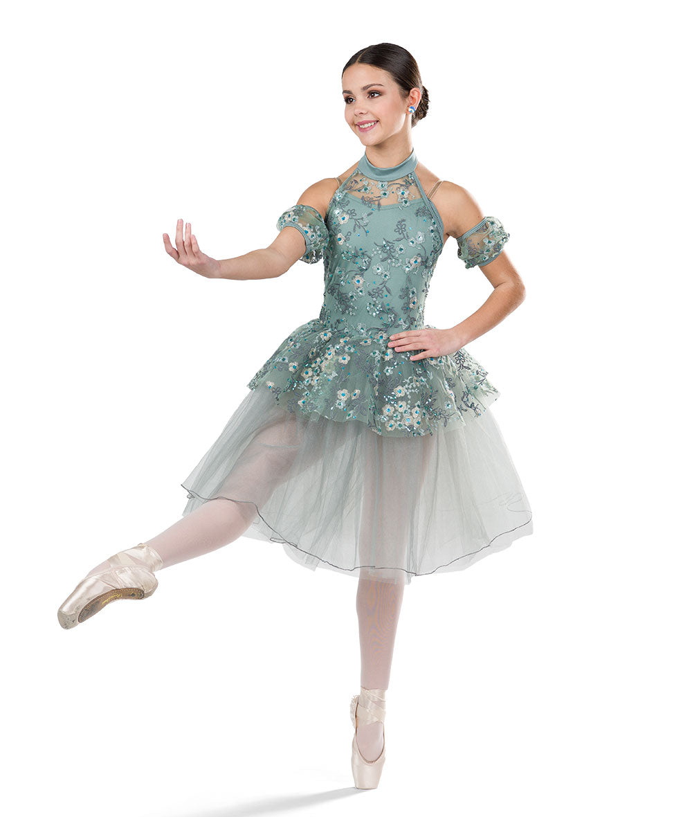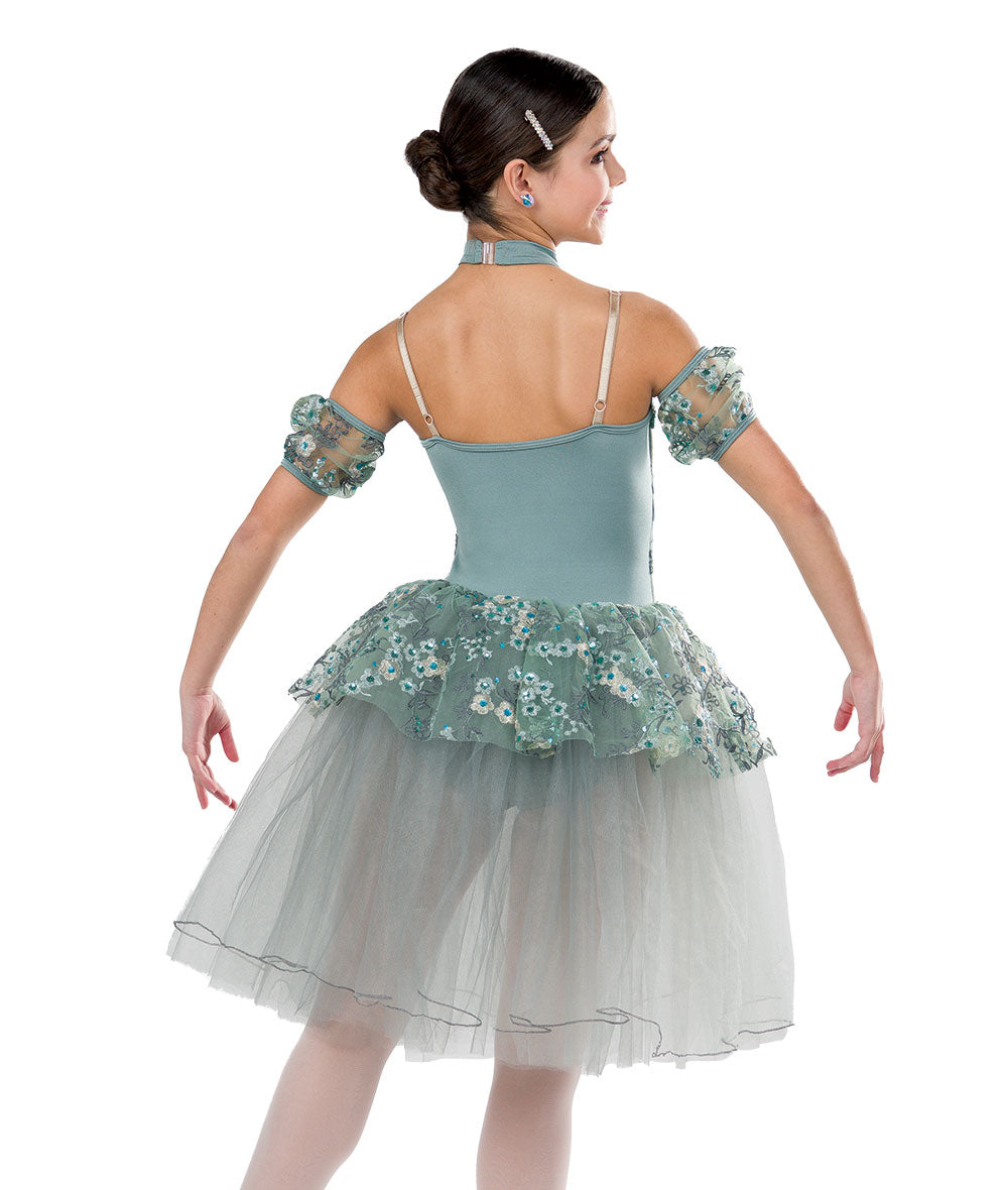 Lined embroidered sequin floral tulle and spandex skirted leotard over attached lettuce edged solid tulle tutu. Imported.