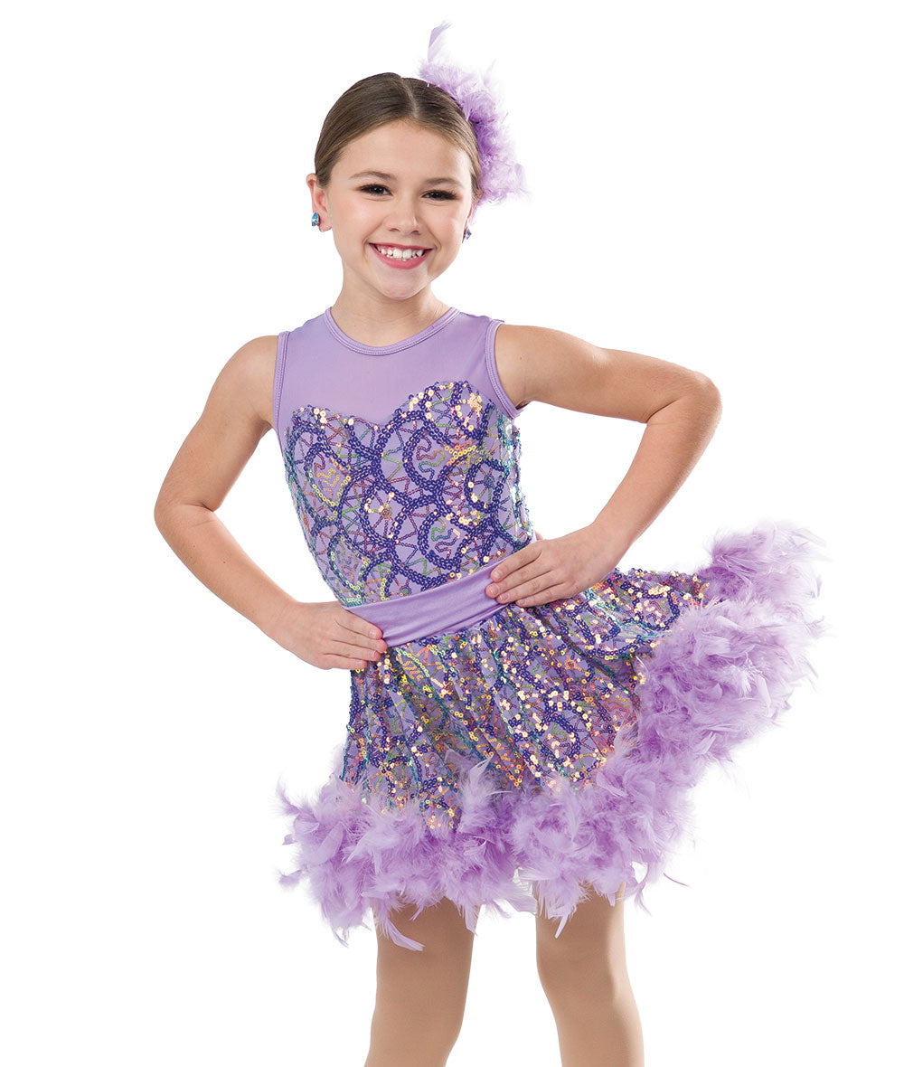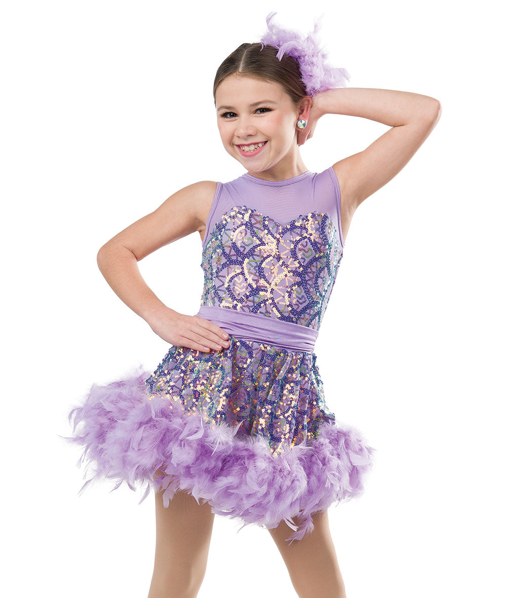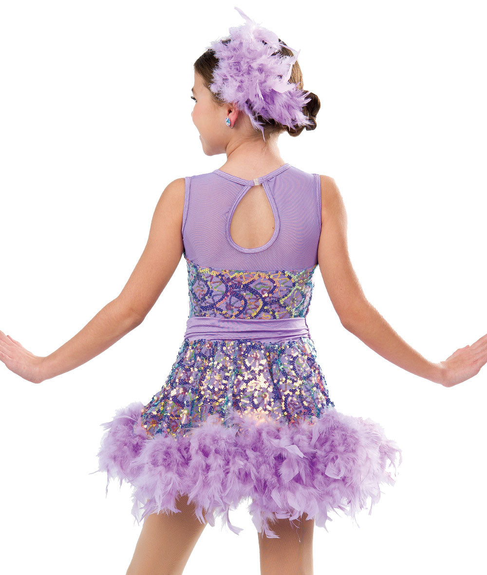 Iridescent sequin mesh dress with solid mesh yoke and boa trim. Lined bodice and attached spandex leotard. Imported.