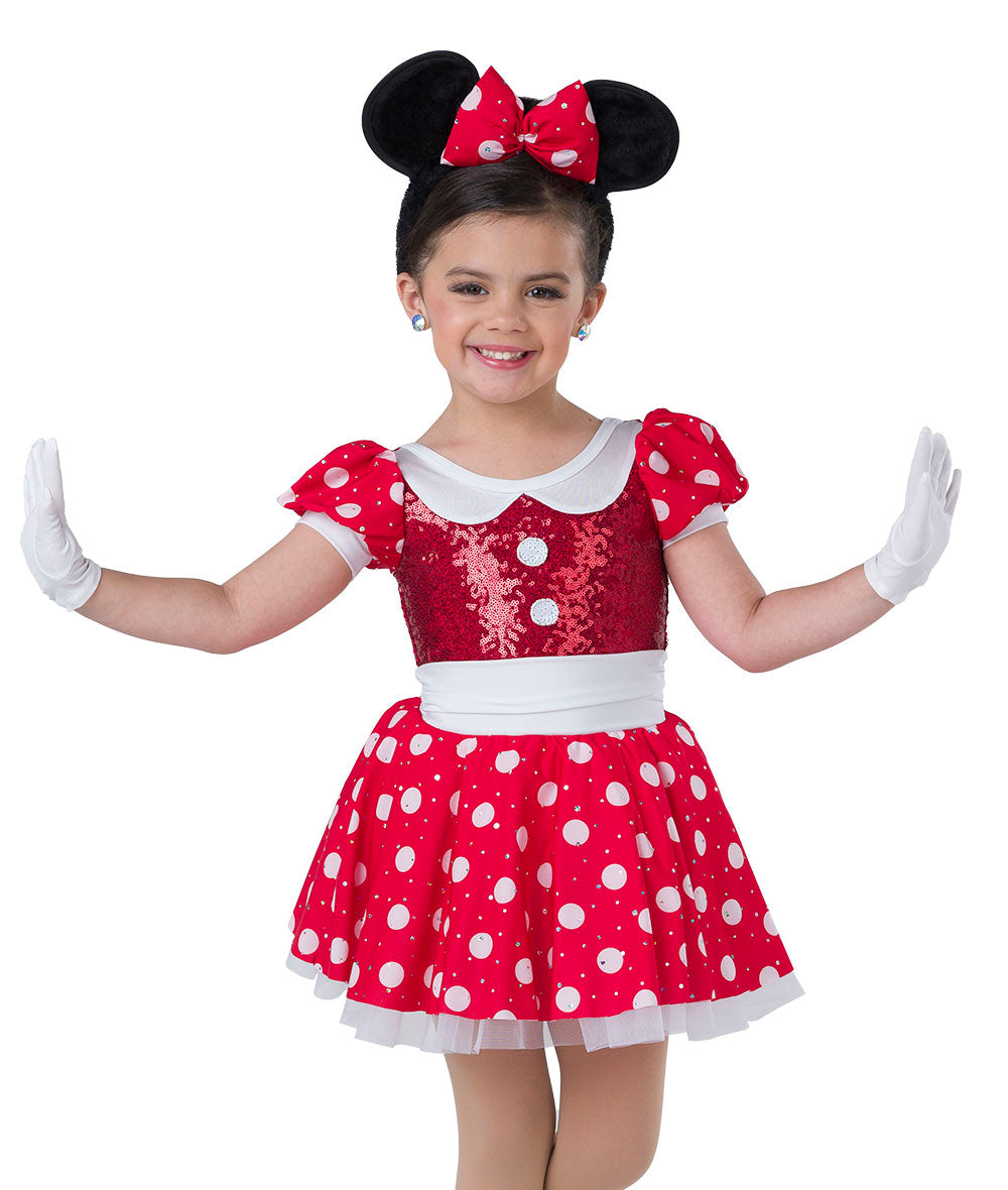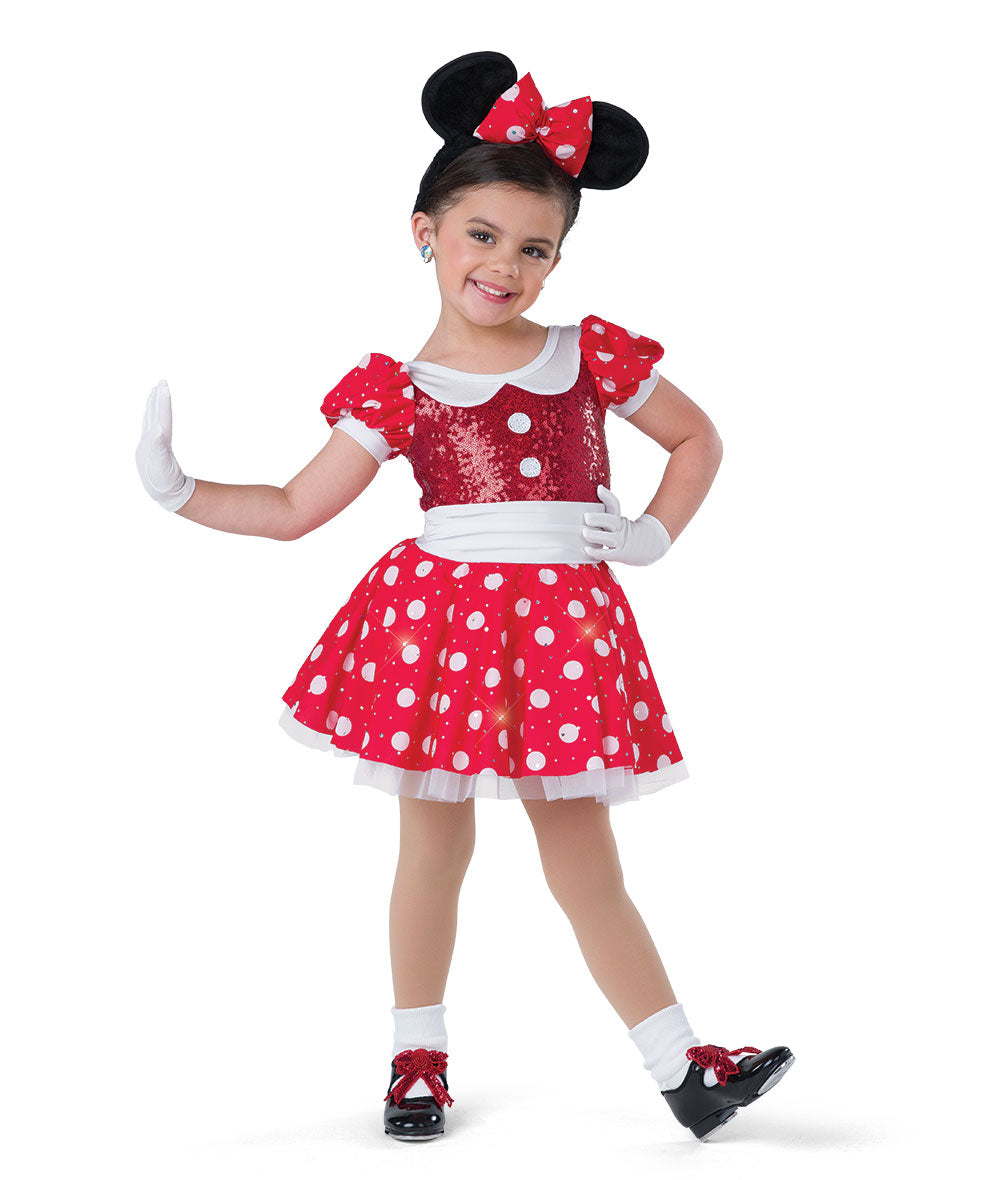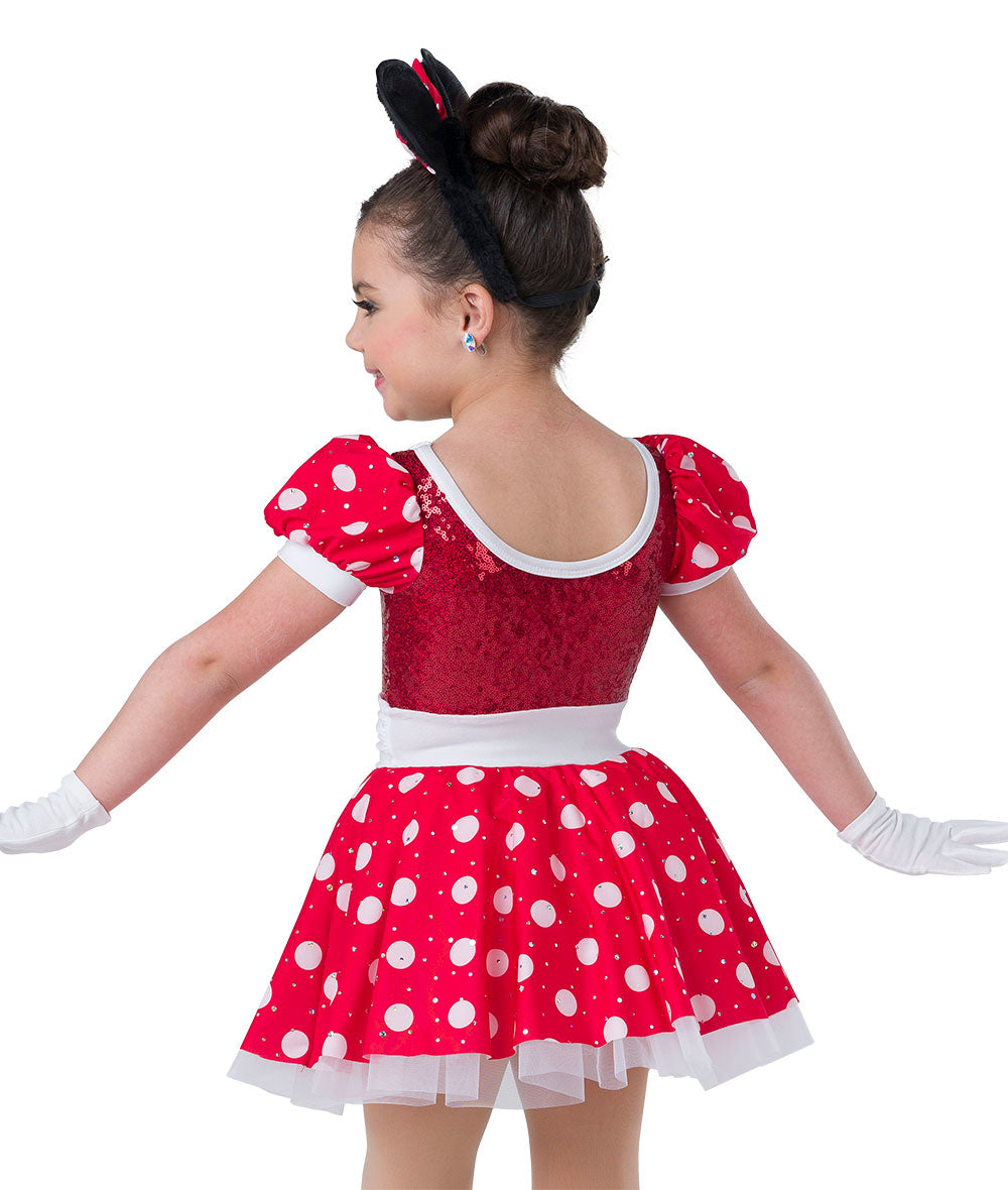 Lined elite sequin and sequin polka dot spandex dress with solid spandex insets and attached sequin appliques. Attached organza crinoline over spandex leotard. Socks and shoe bows sold separately. Imported.