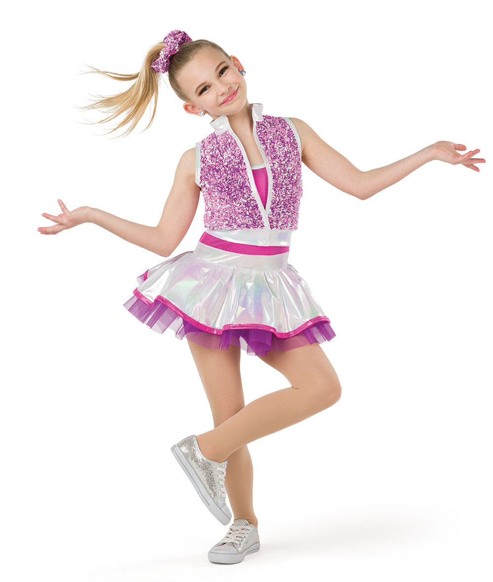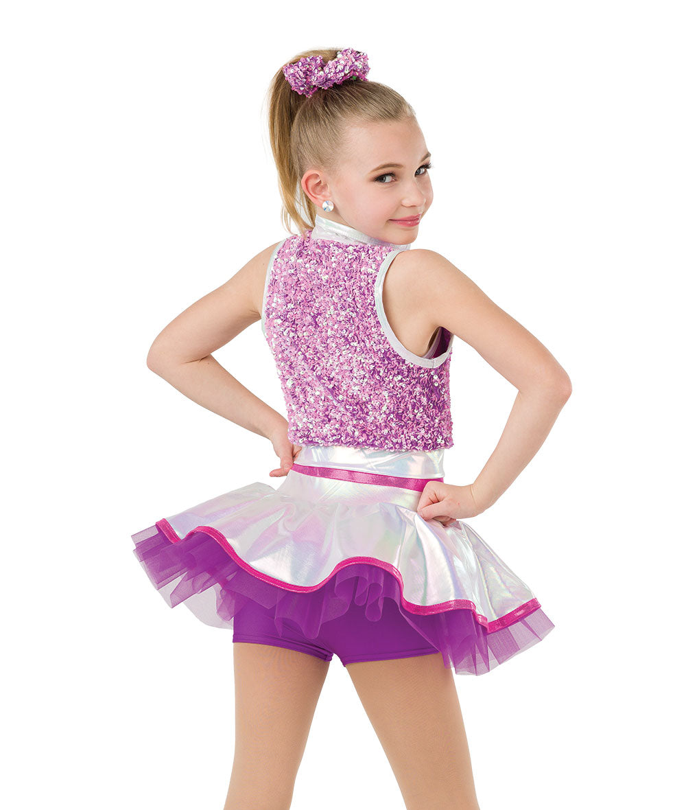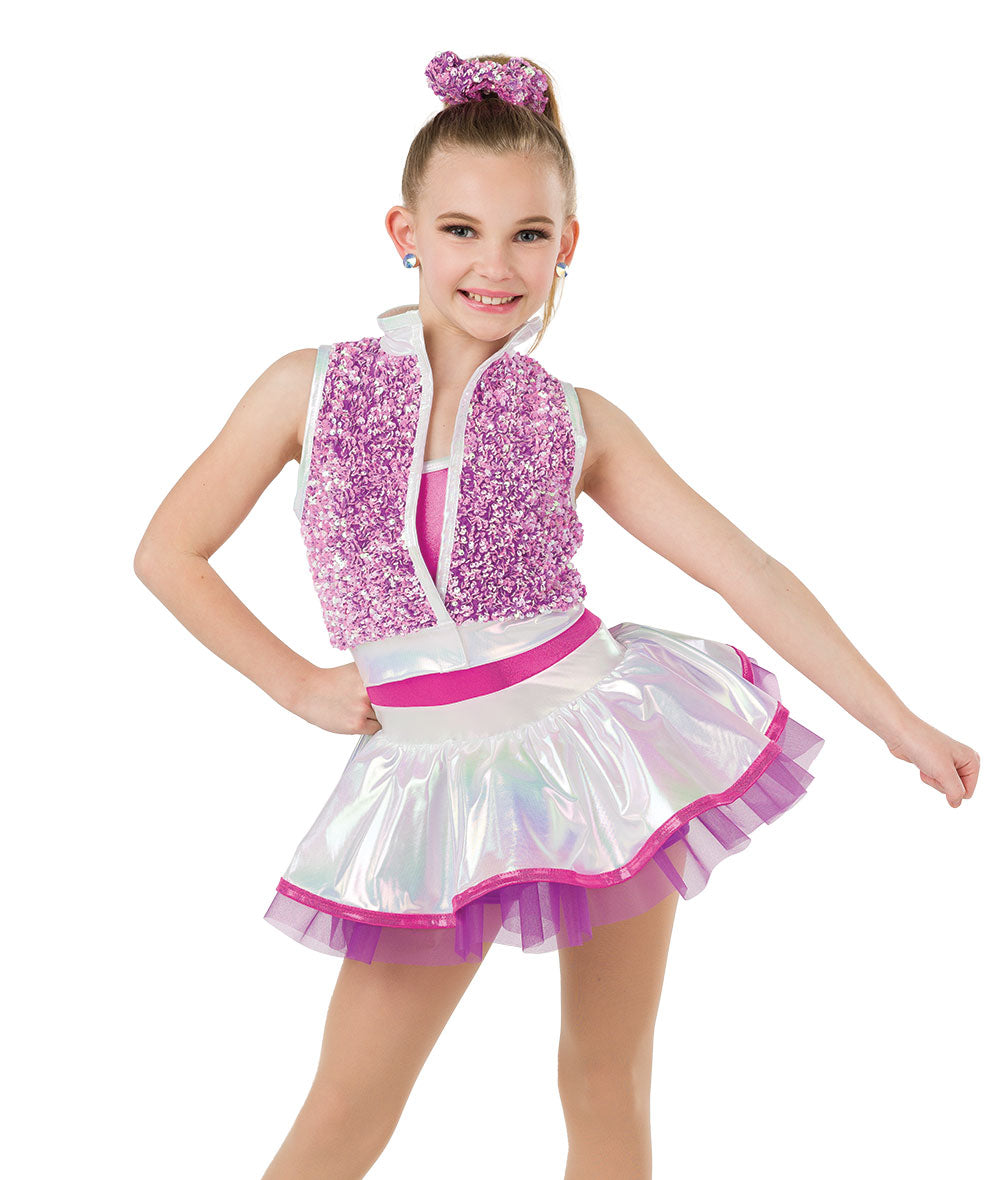 Foil lycra and spandex shortall with attached iridescent foil spandex and organza skirt. Iridescent sequin velvet vest with iridescent foil spandex trim and velcro closure. Made in the USA.