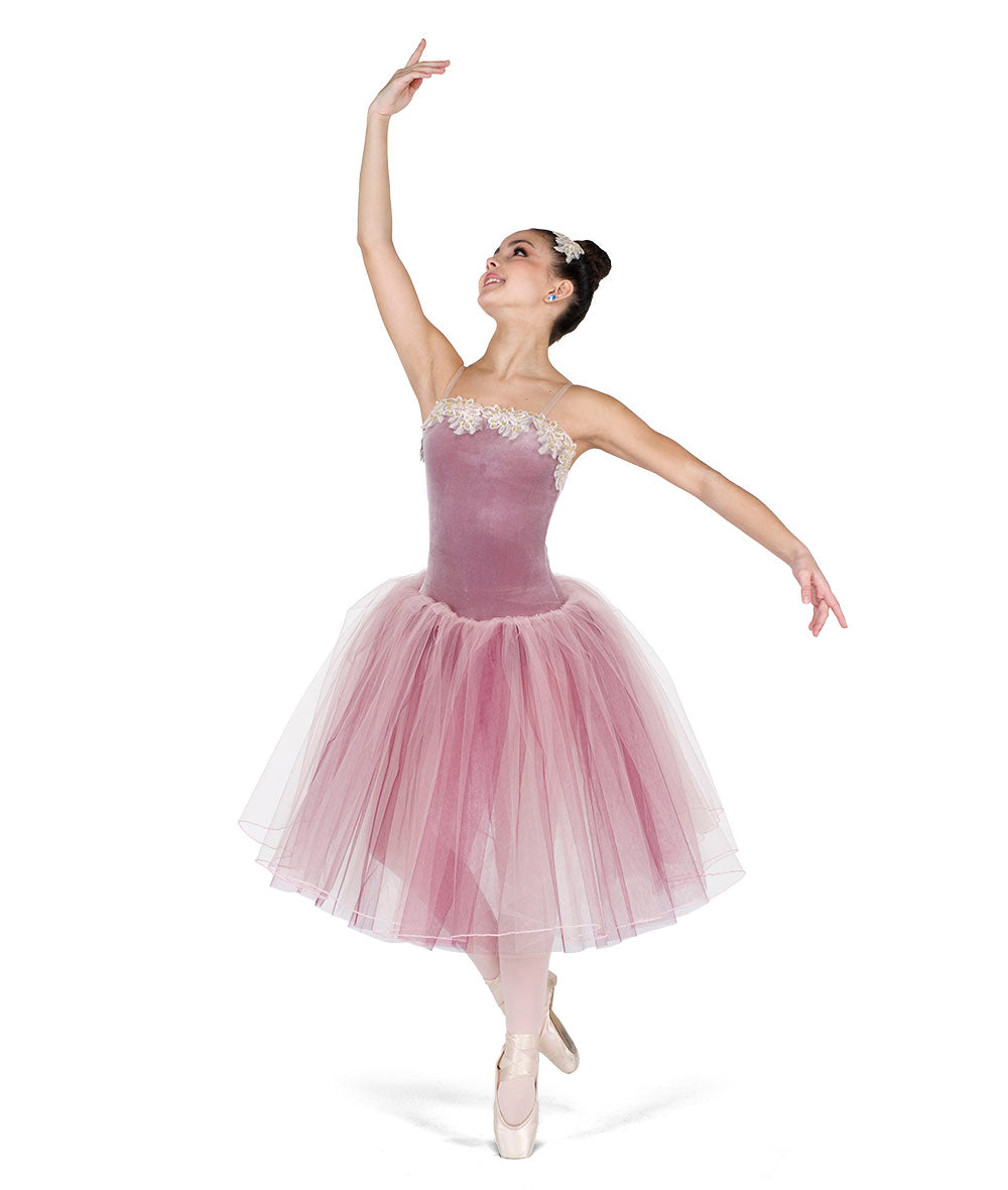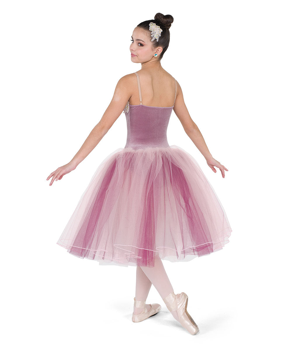 Velvet leotard with attached pearl embroidered applique and tan adjustable straps. Attached lettuce edged tulle tutu. Made in the USA.