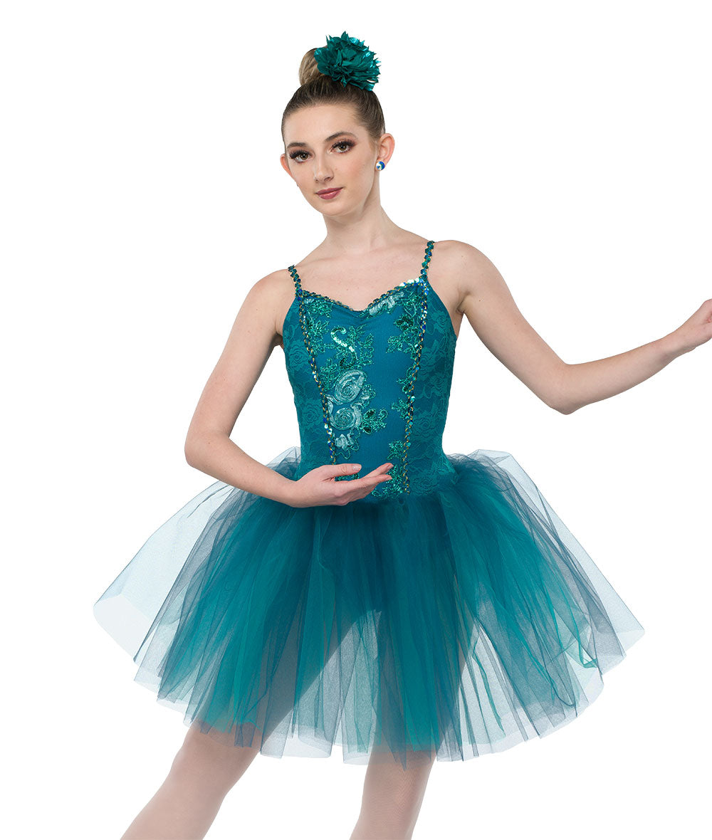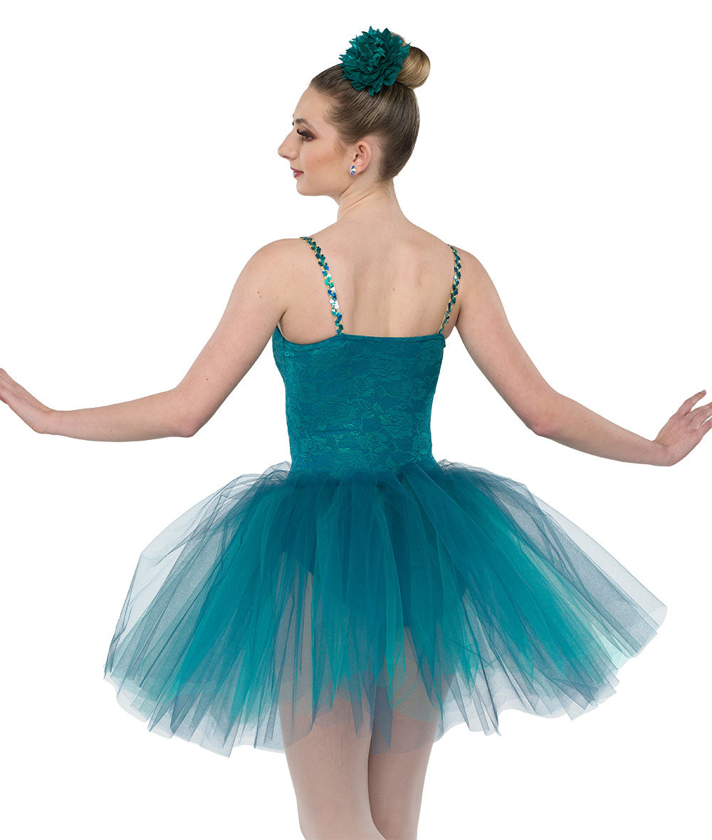 Lined embroidered sequin tulle, floral lace and spandex leotard with sequin trim. Attached tulle tutu. Pattern may vary. Made in the USA.