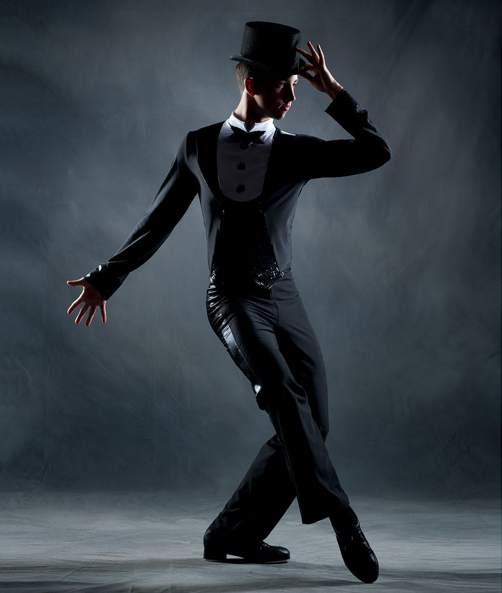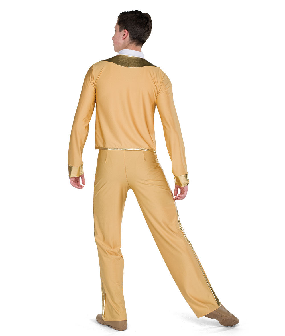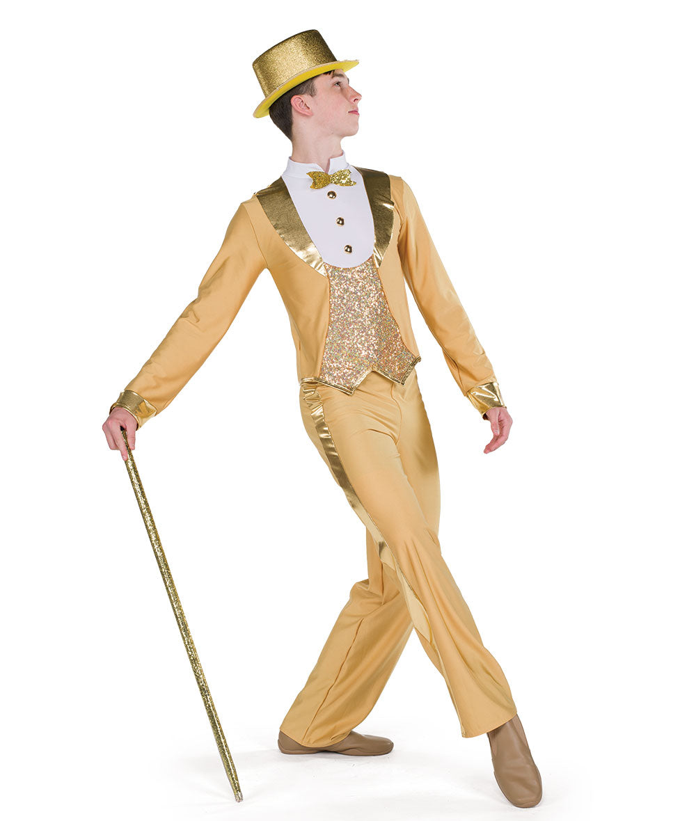 Elite sequin and solid spandex shirt and pants with flat foil lycra insets. Attached tack buttons and bow tie. Hat sold separately. Made in the USA.