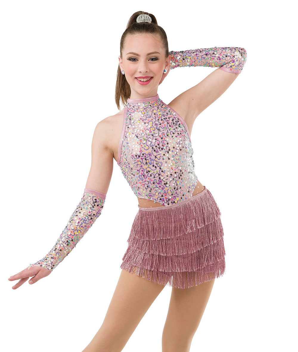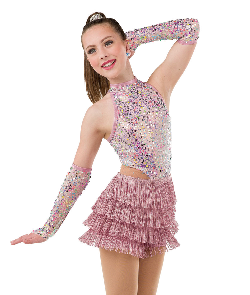 Lined multicolor iridescent sequin mesh and foil lycra shortall with tan sequin dot mesh insets. Attached metallic fringe skirt. Mitts sold separately. Made in the USA.