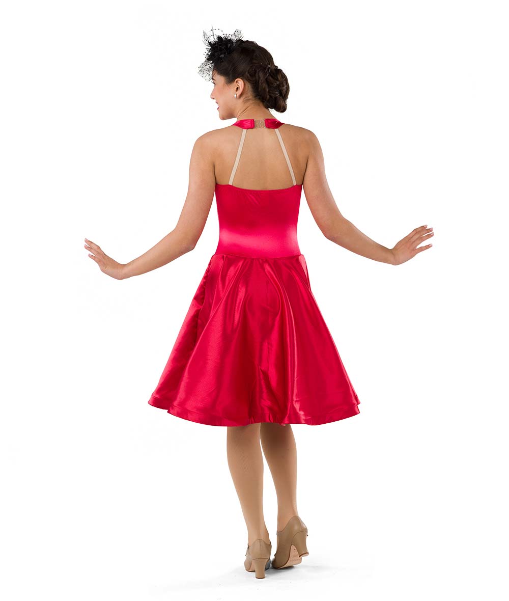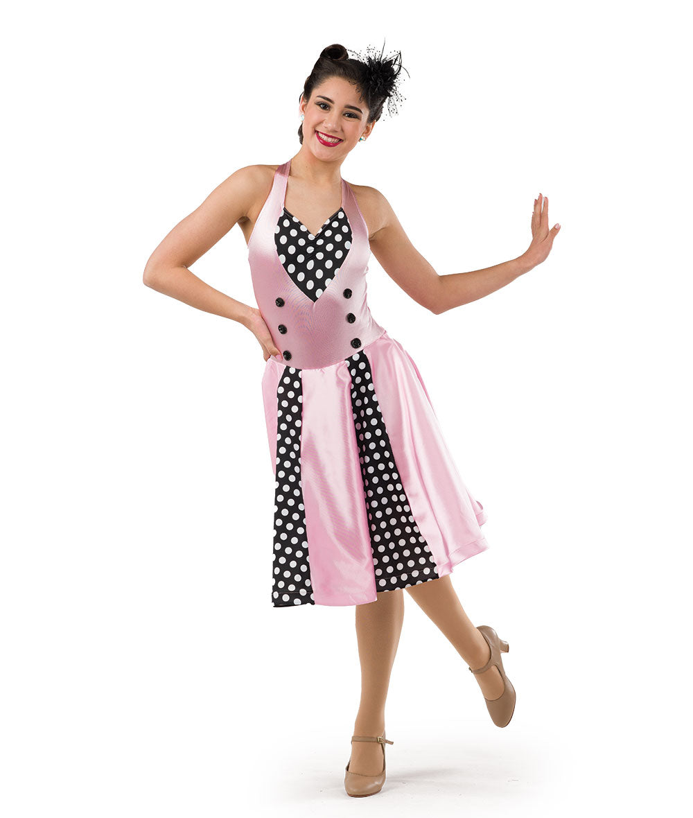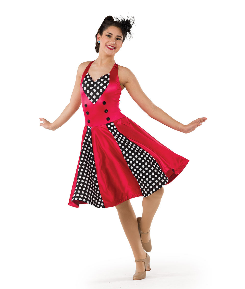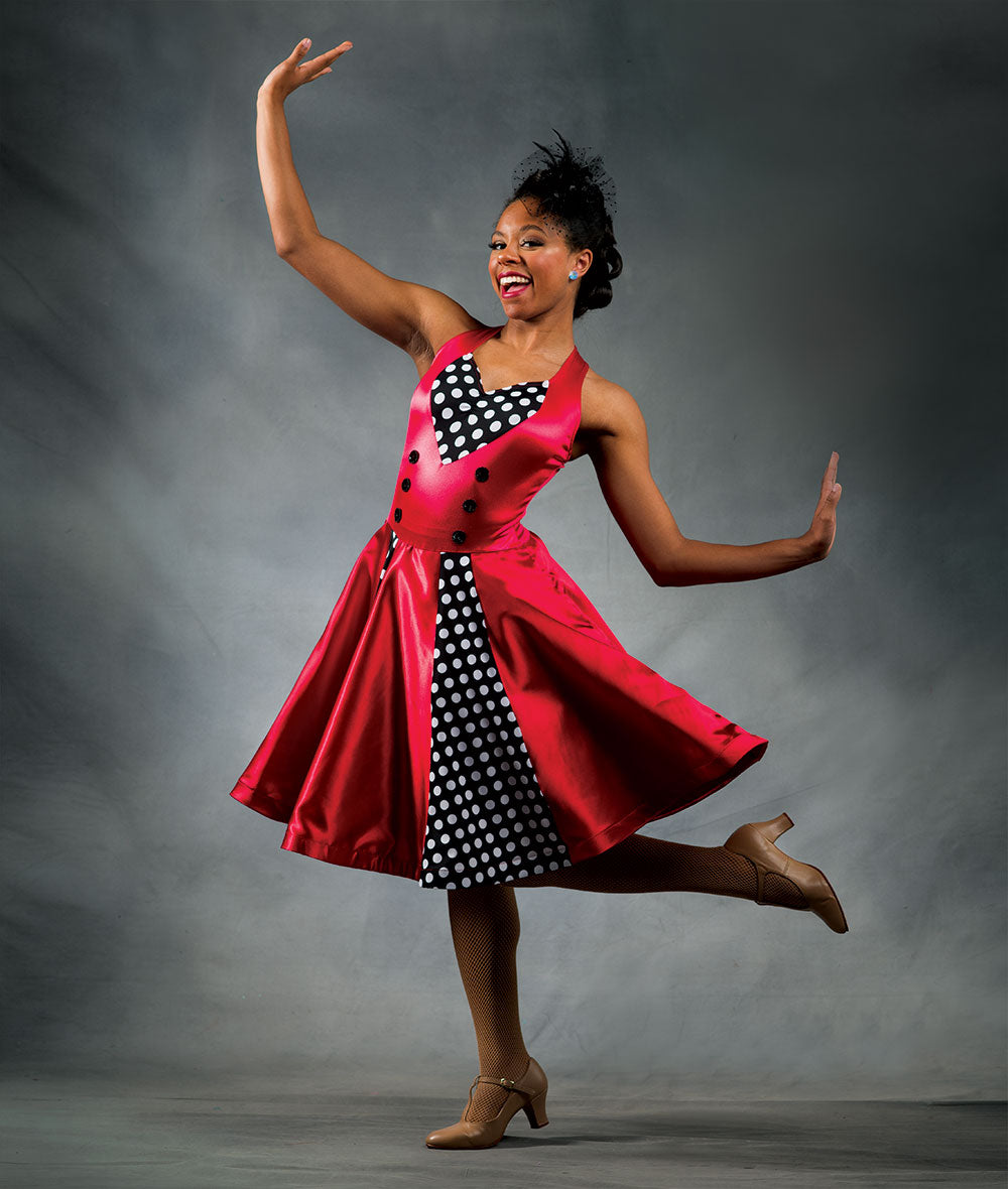 Stretch satin and polka dot spandex dress with attached sequin circle appliques and horsehair trim. Attached spandex leotard. Made in the USA.