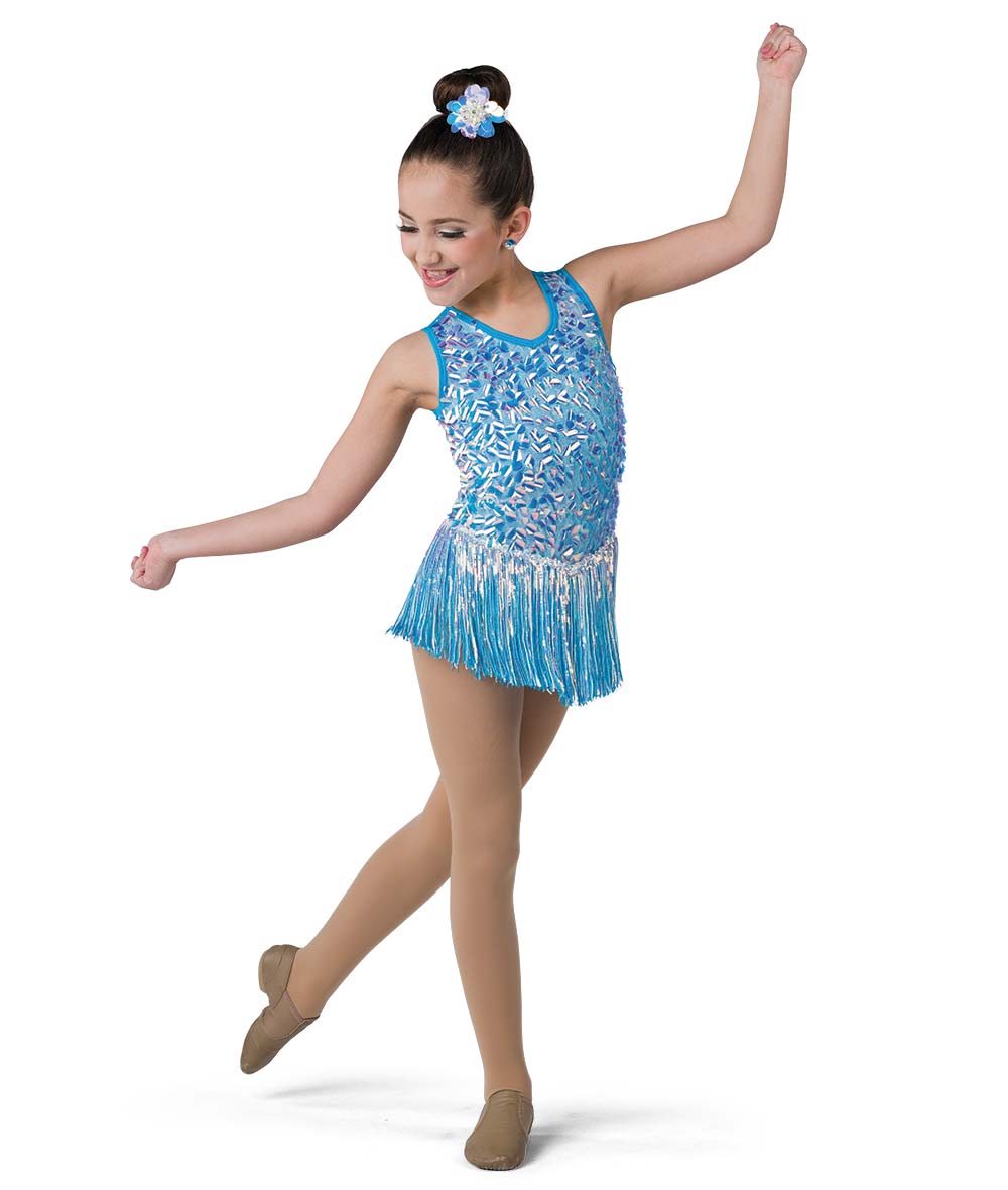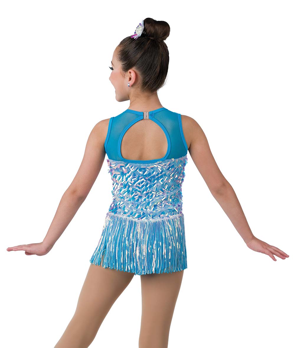 Lined iridescent 3D sequin, solid mesh and spandex leotard with attached sequin fringe skirt. Imported.