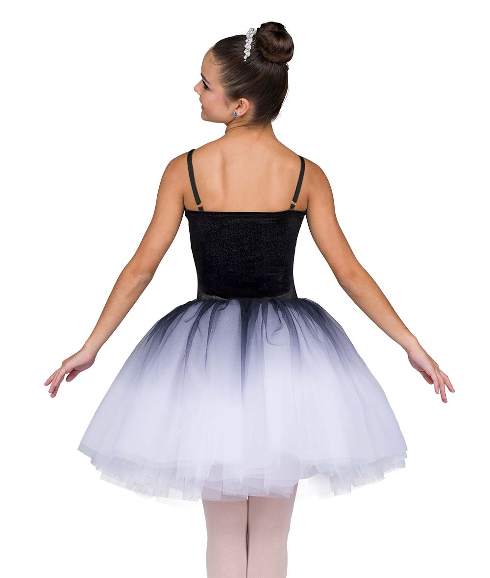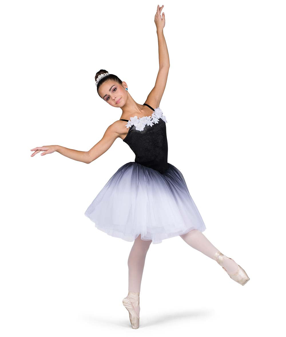 Shimmer velvet and spandex leotard with attached floral appliques and adjustable straps. Attached ombre and solid organza tutu. Imported.