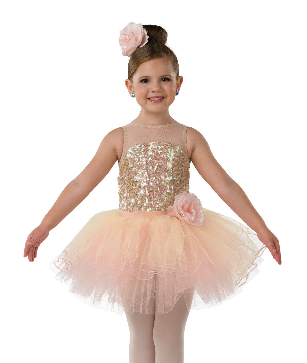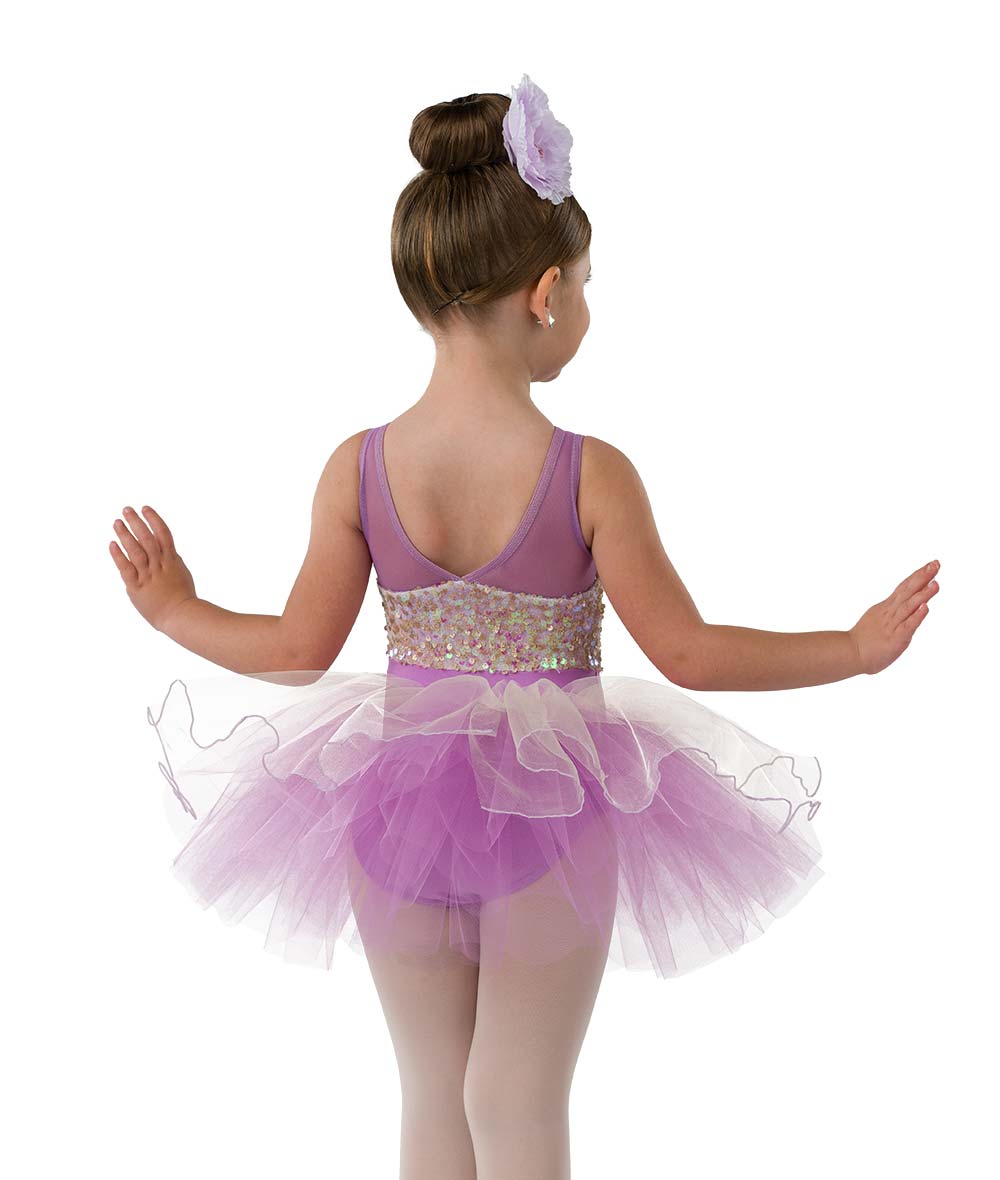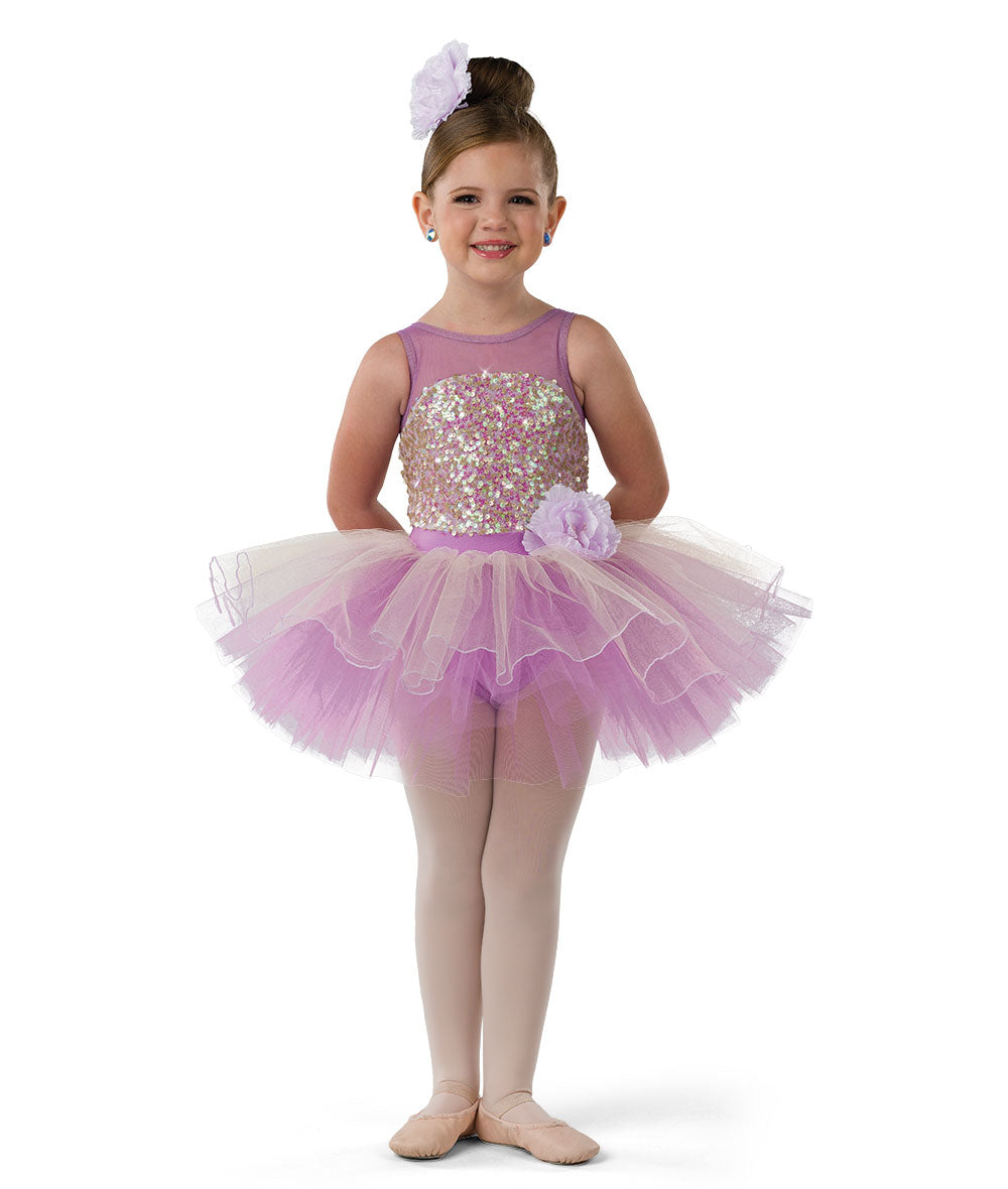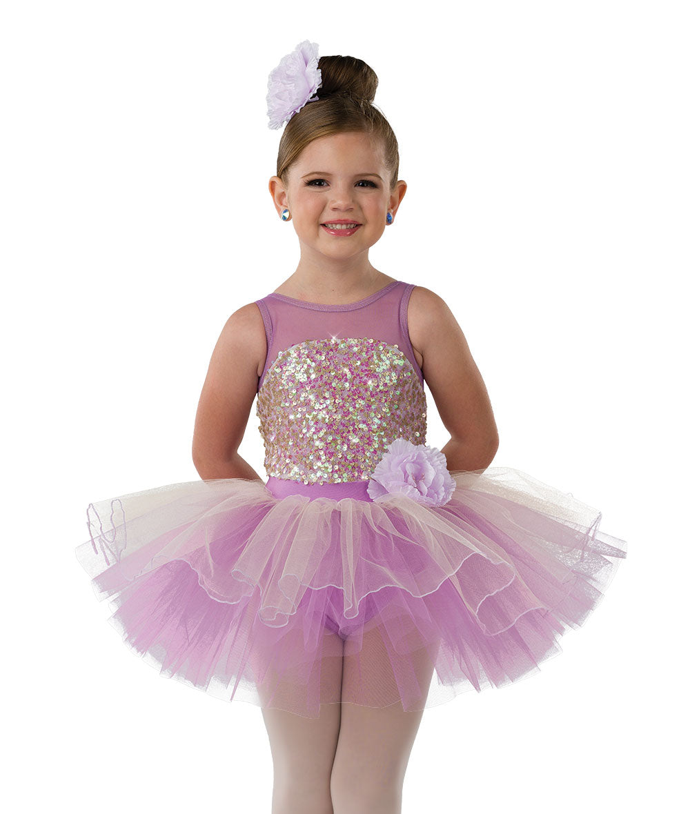 Lined iridescent sequin, solid mesh and spandex leotard with attached flower. Attached lettuce edged tulle tutu. Made in the USA.