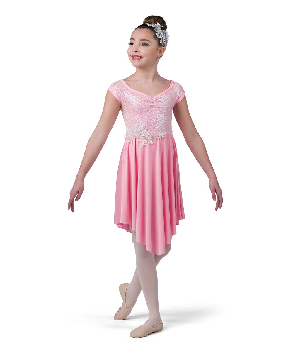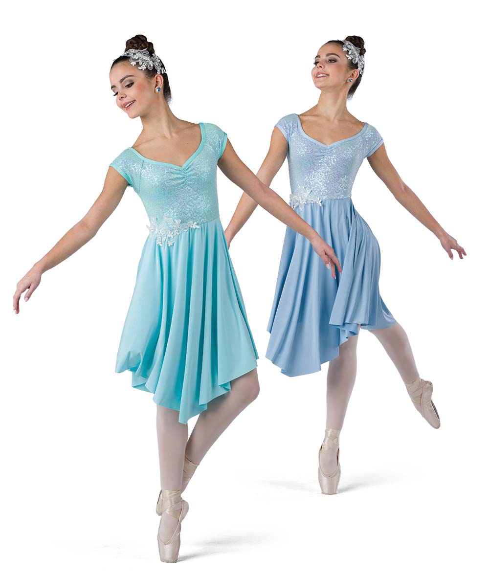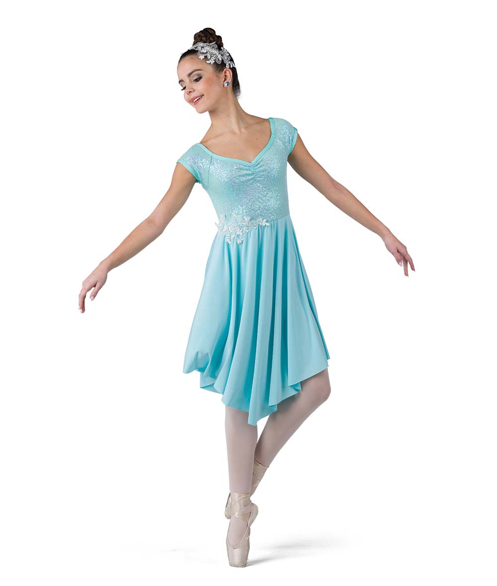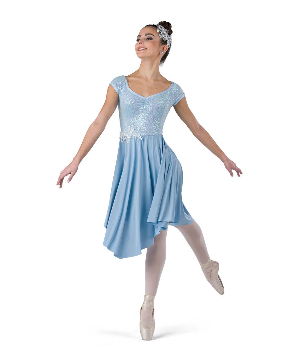 Lined sequin and glossy spandex dress with sequin applique over attached leotard. Made in the USA.