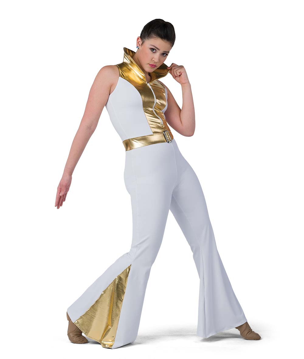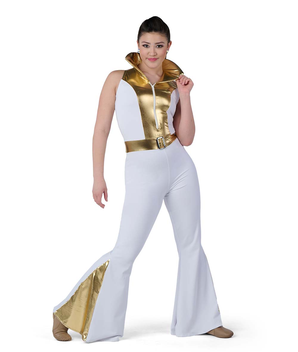 Dryfit and flat foil lycra unitard with flare pants, foam-covered collar and attached buckle. Zipper front. Made in the USA.