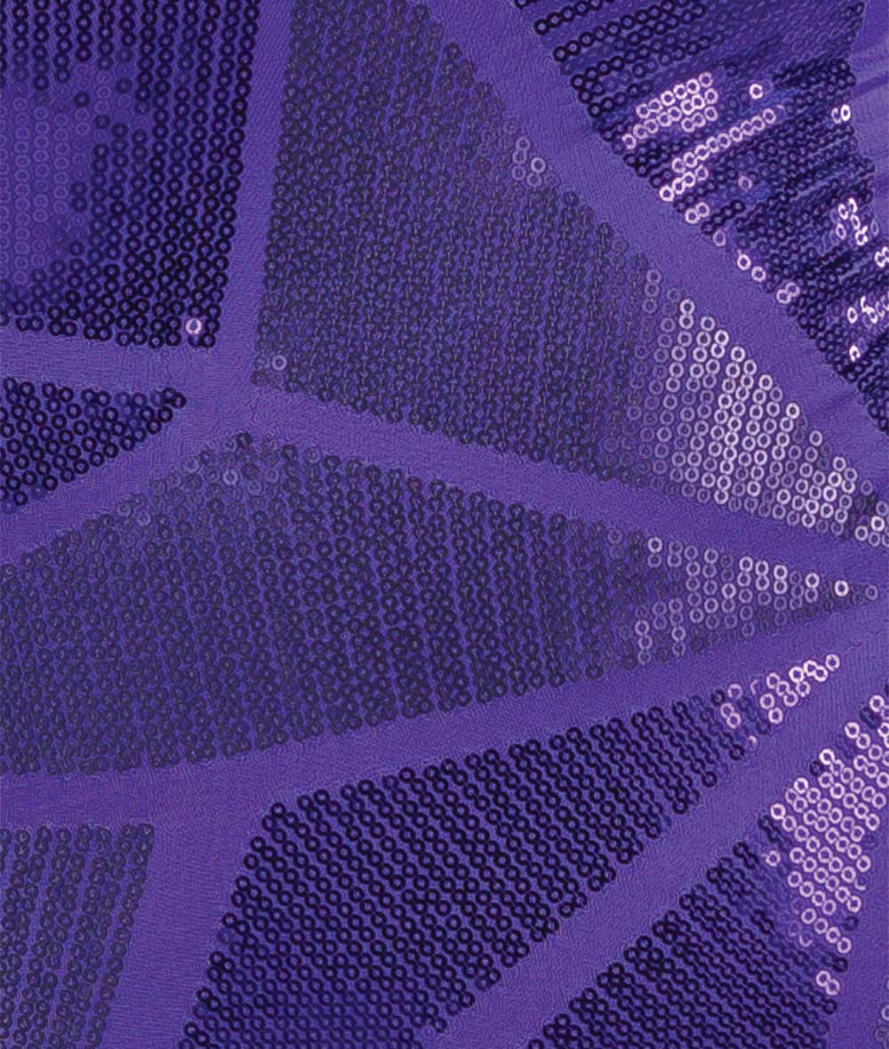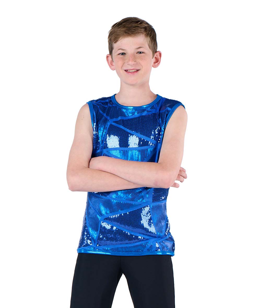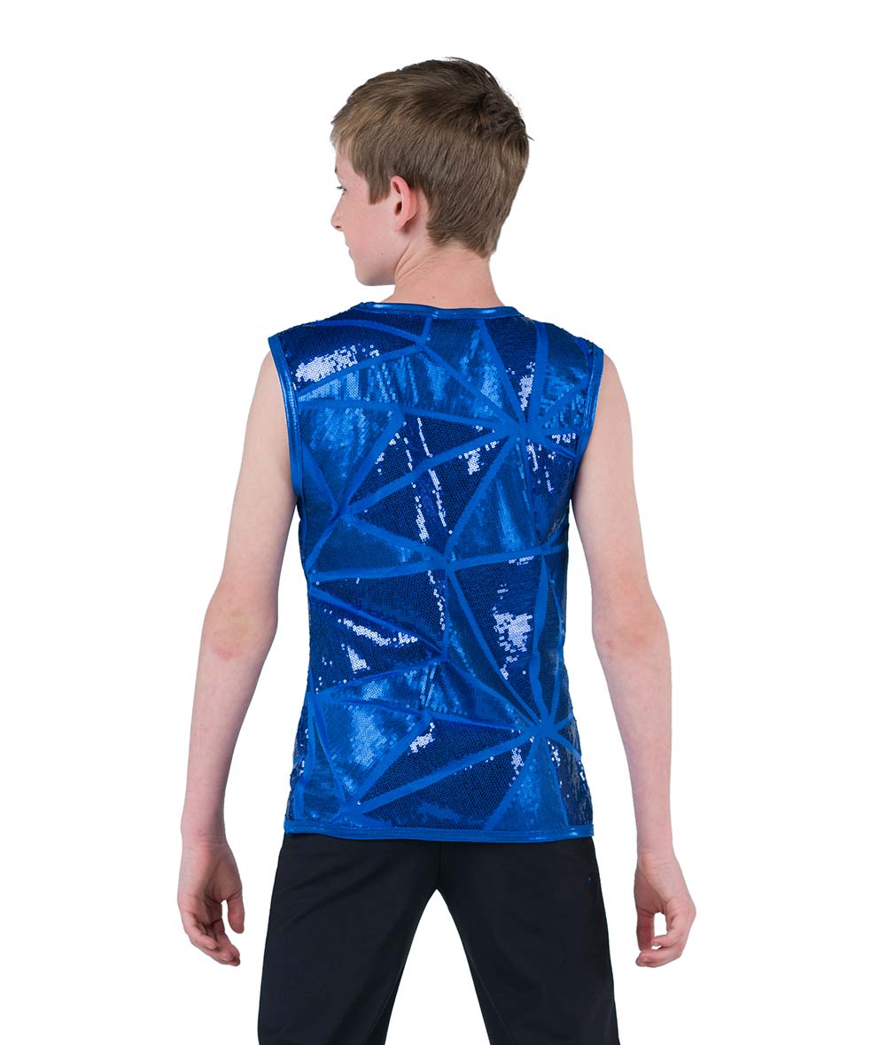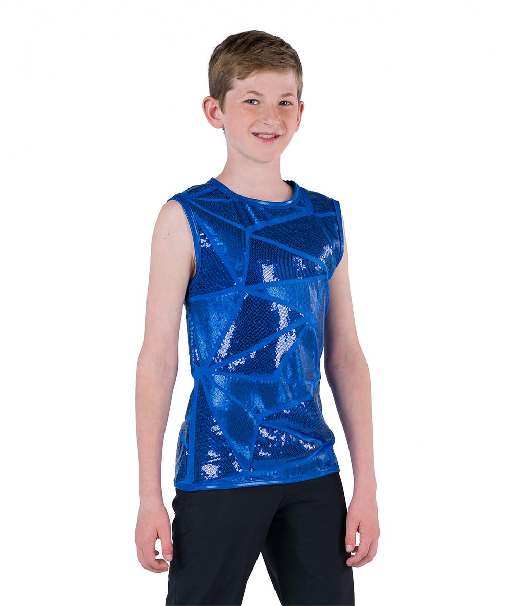 Lined sequin shards pattern spandex tank with foil lycra trim. Pants sold separately. Made in the USA.