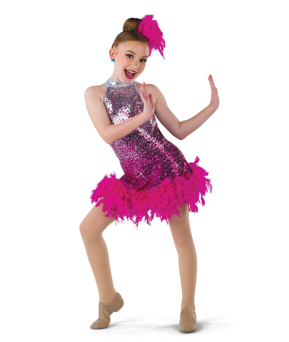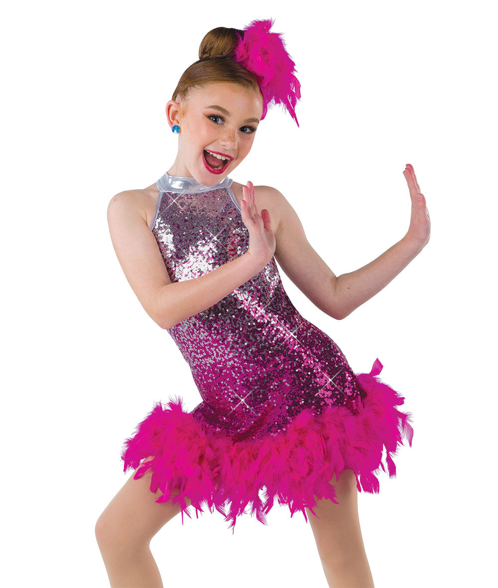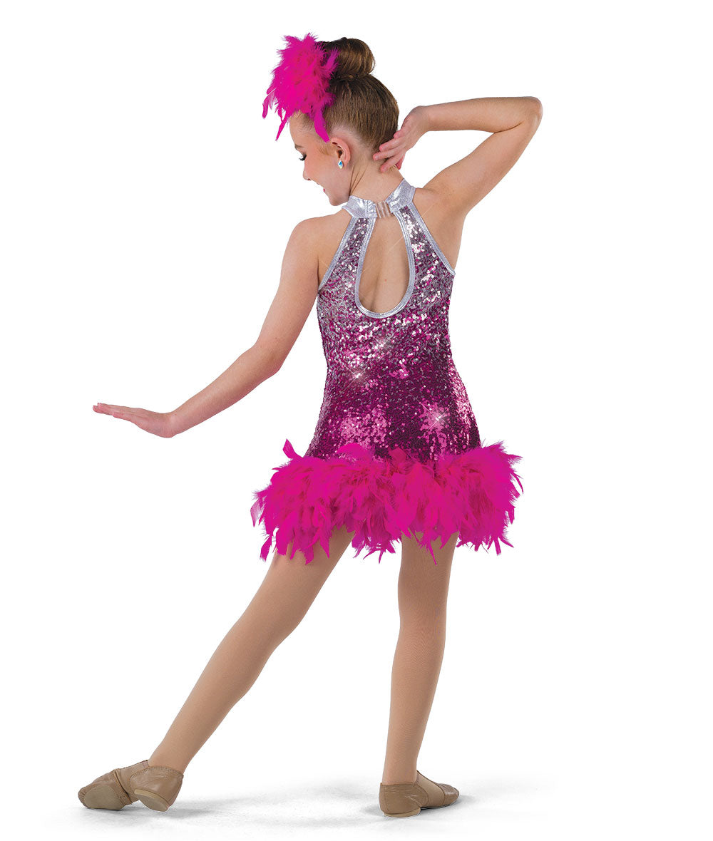 Lined ombre sequin spandex dress with boa hem over attached leotard. Imported.