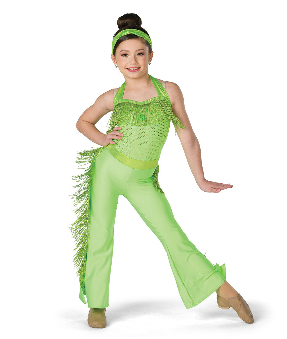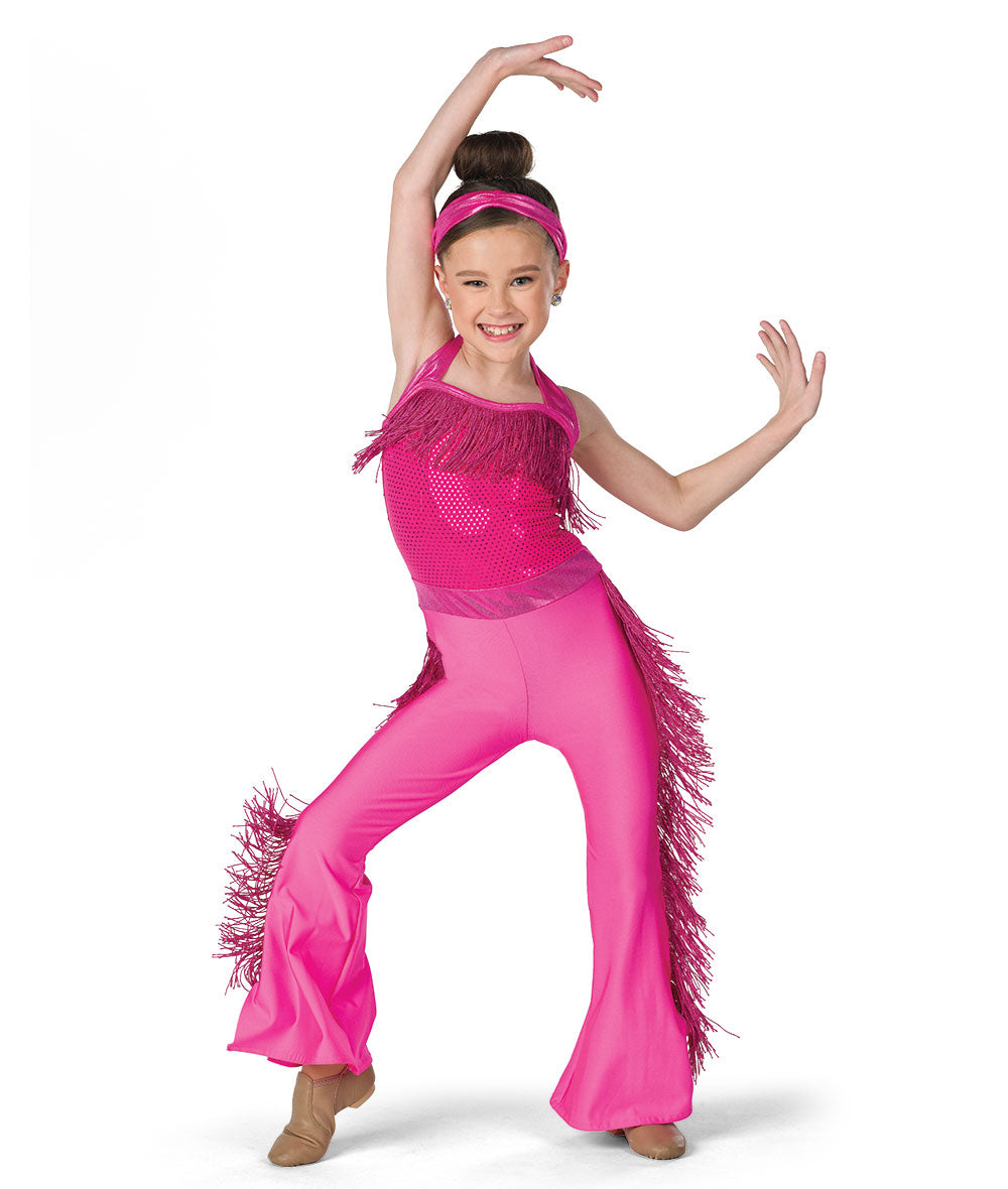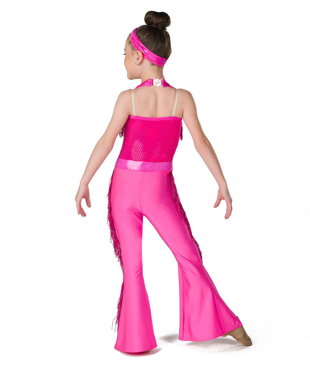 Lined sequin dot and solid spandex bell bottom unitard with attached metallic fringe trim. Made in the USA.