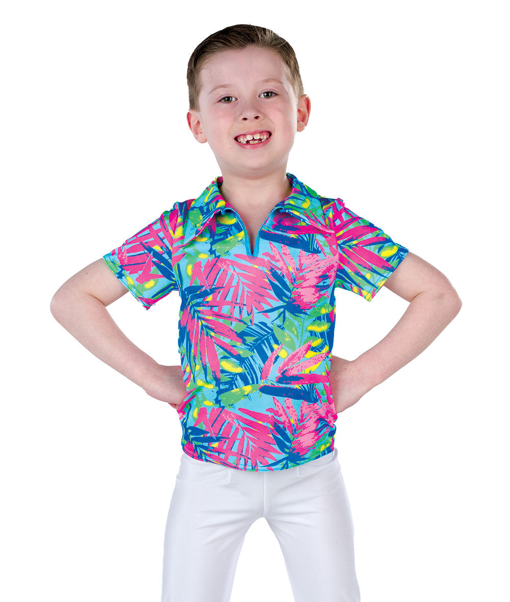 Tropical print spandex collared shirt. Pants sold separately. Made in the USA.