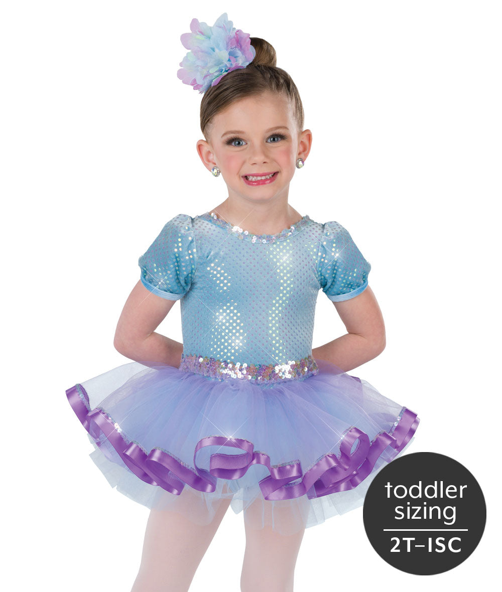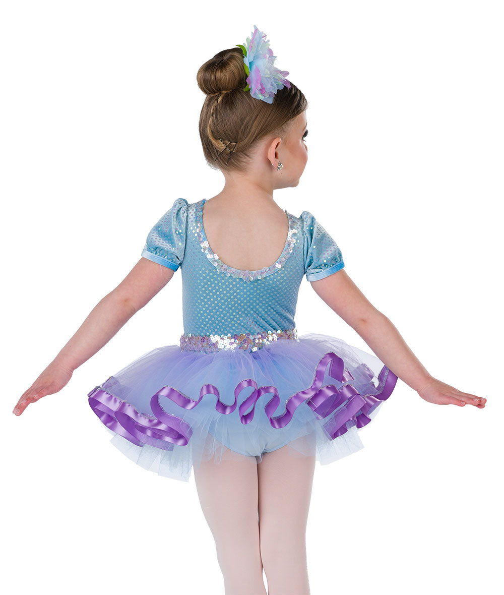 Sequin dot velvet and spandex leotard with sequin trim. Attached sequin and ribbon trimmed tulle tutu. Made in the USA.