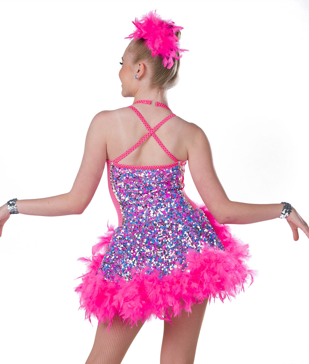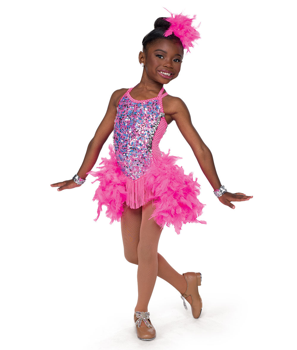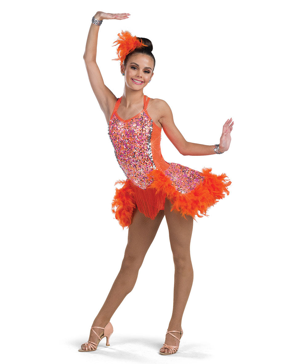 Lined multicolor sequin mesh and sequin dot spandex leotard with backskirt. Attached fringe front skirt and organza back bustle with boa trim. Shoe bows sold separately. Made in the USA.