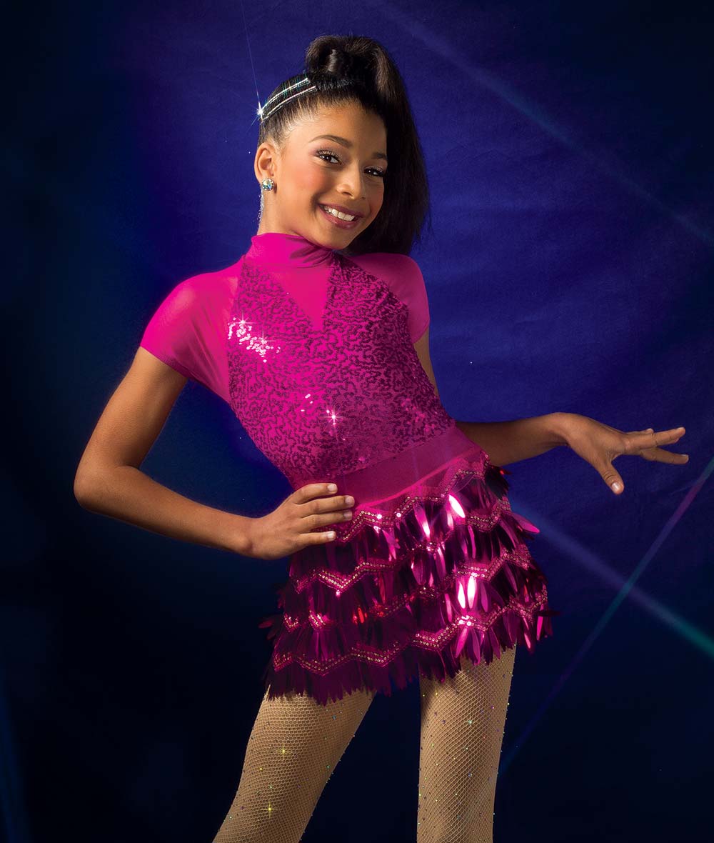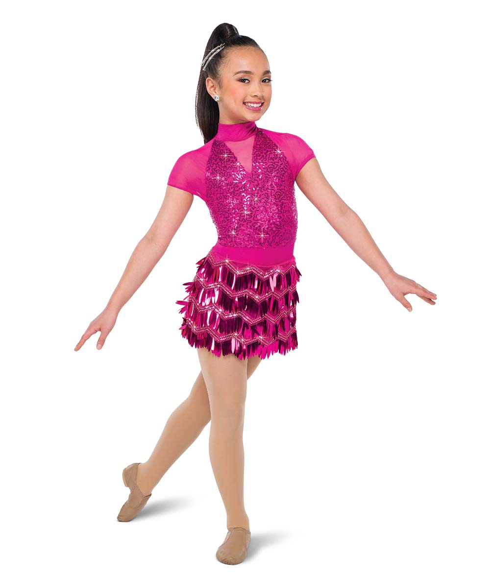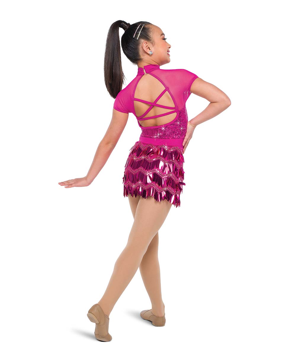 Lined sequin and solid spandex shortall with mesh insets. Attached chevron paillette sequin fringe skirt. Imported.