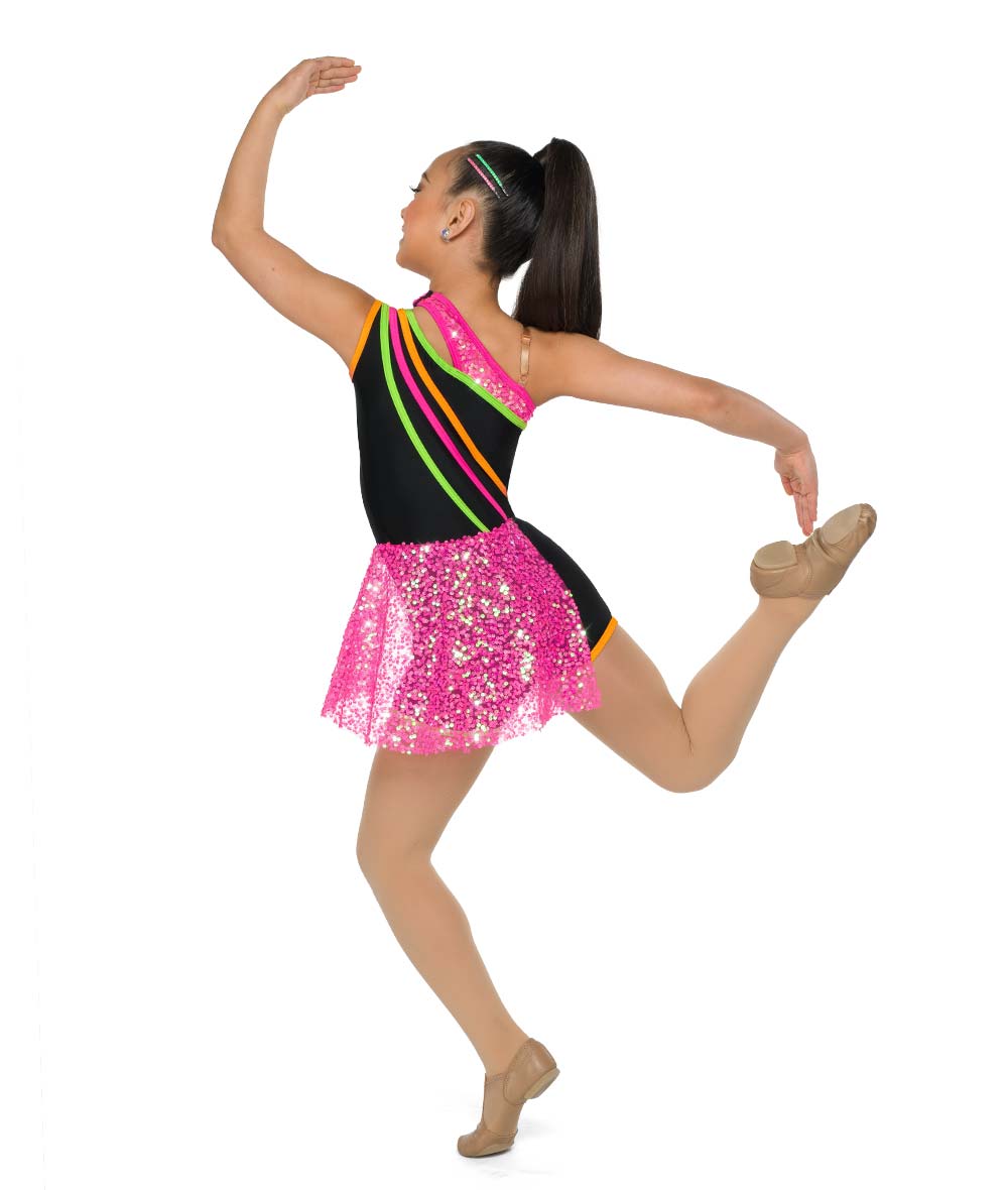 Spandex and sequin mesh shortall with side skirt, contrasting trim and mesh inset. Attached tan adjustable strap. Imported.