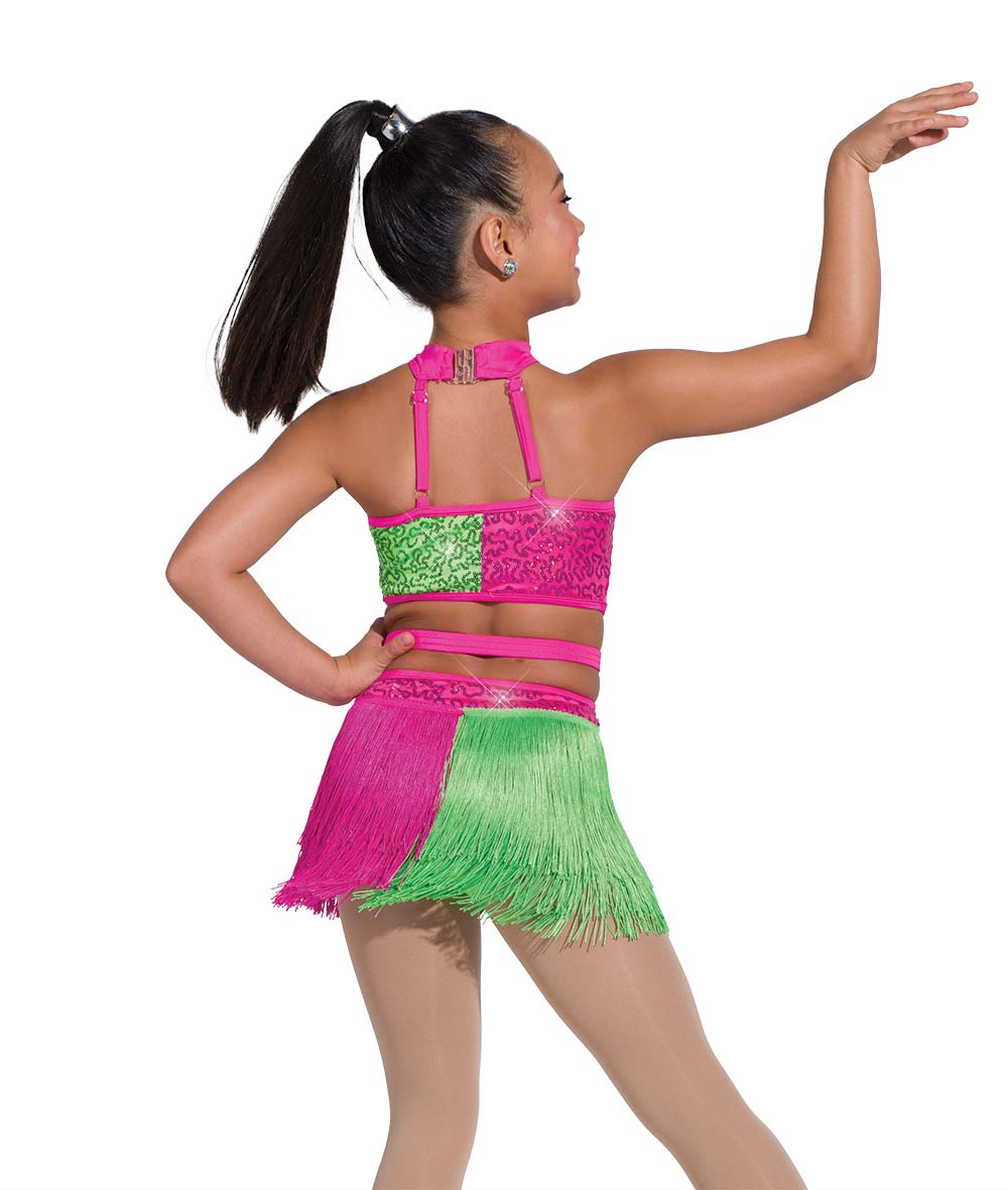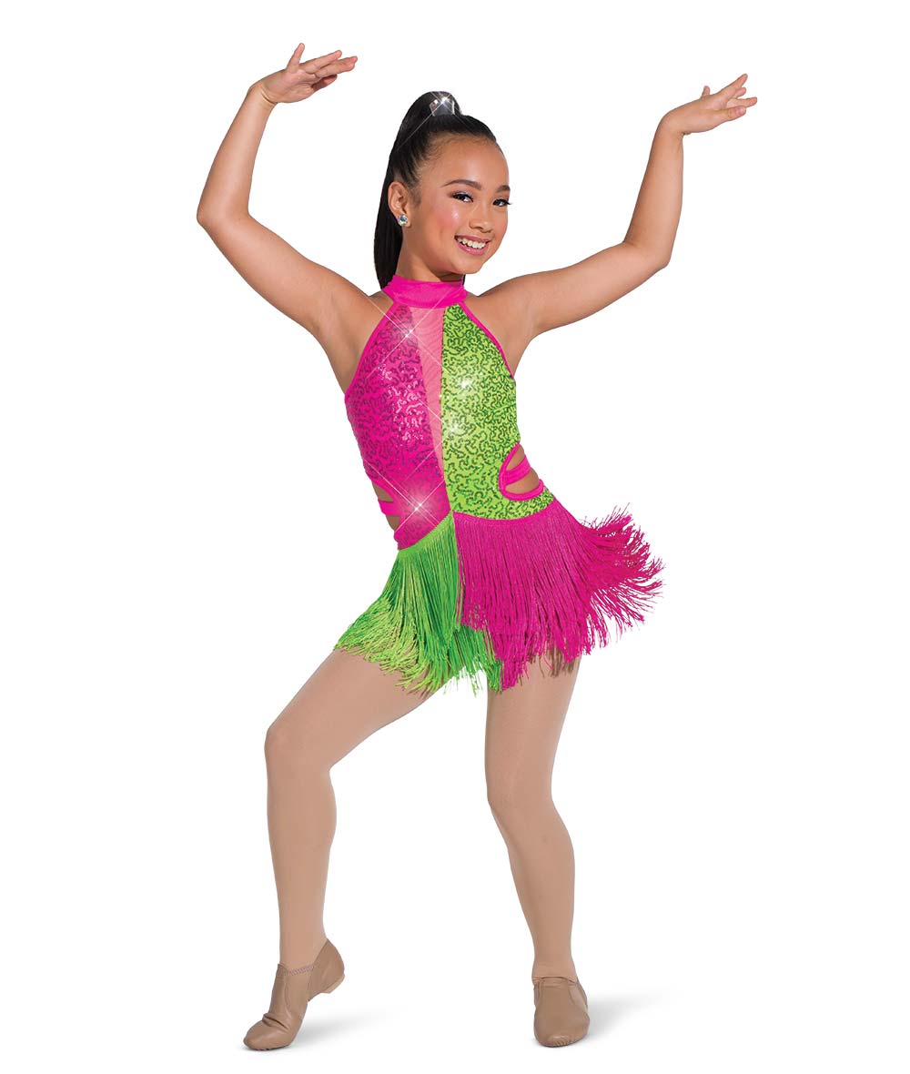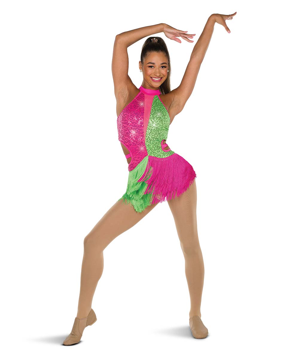 Lined sequin and solid spandex color blocked leotard with attached fringe skirt and cutout. Lined mesh front inset and adjustable straps. Imported.