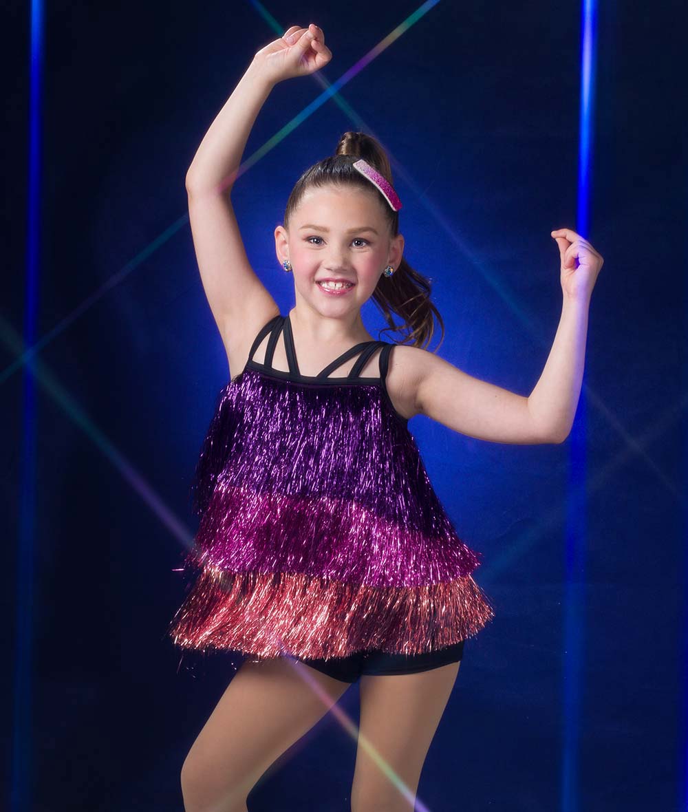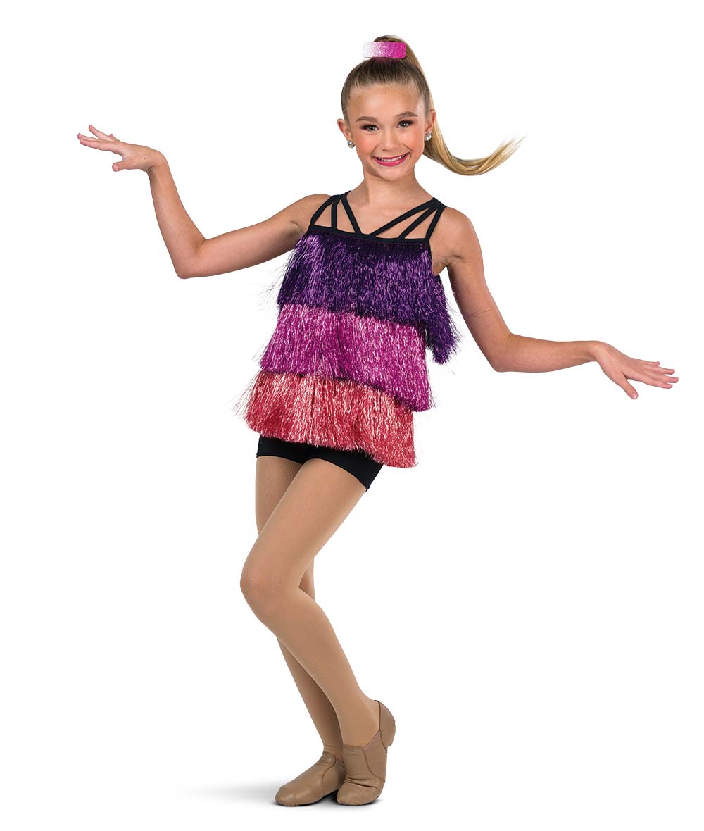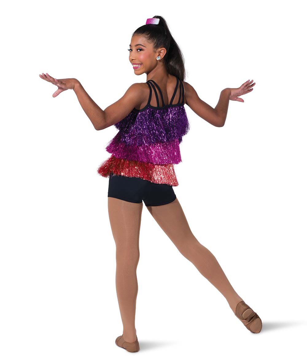 Tiered tinsel fringe tunic over attached spandex shortall. Imported.