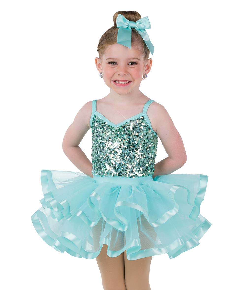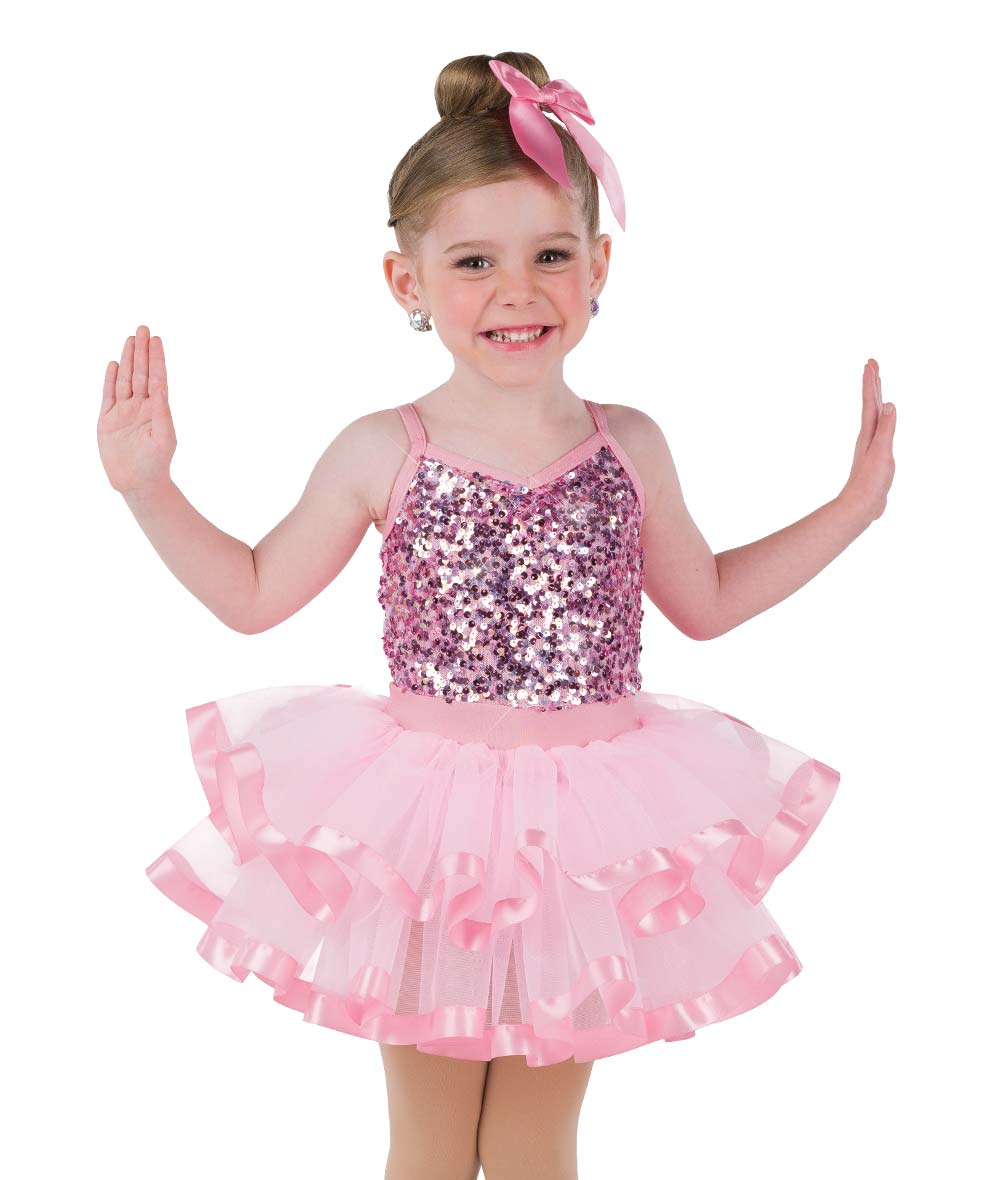 Lined small paillette sequin mesh and spandex leotard with attached ribbon trimmed organza tutu. Shoe bows sold separately. Made in the USA.