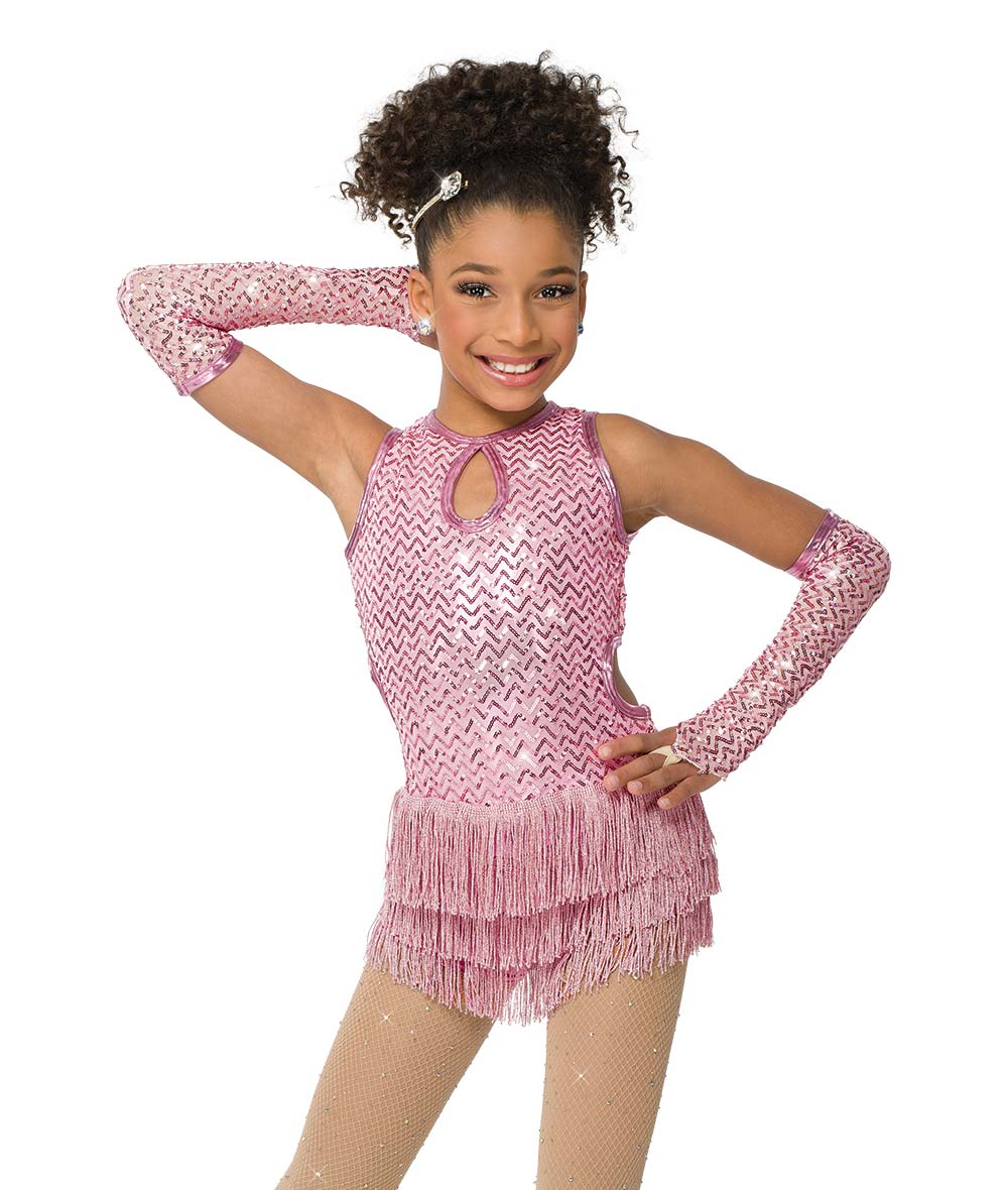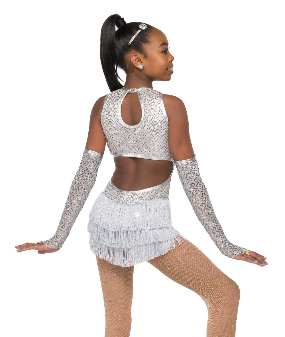 Lined zigzag sequin mesh and flat foil lycra leotard with attached metallic fringe skirt and open back. Mitts sold separately. Made in the USA.