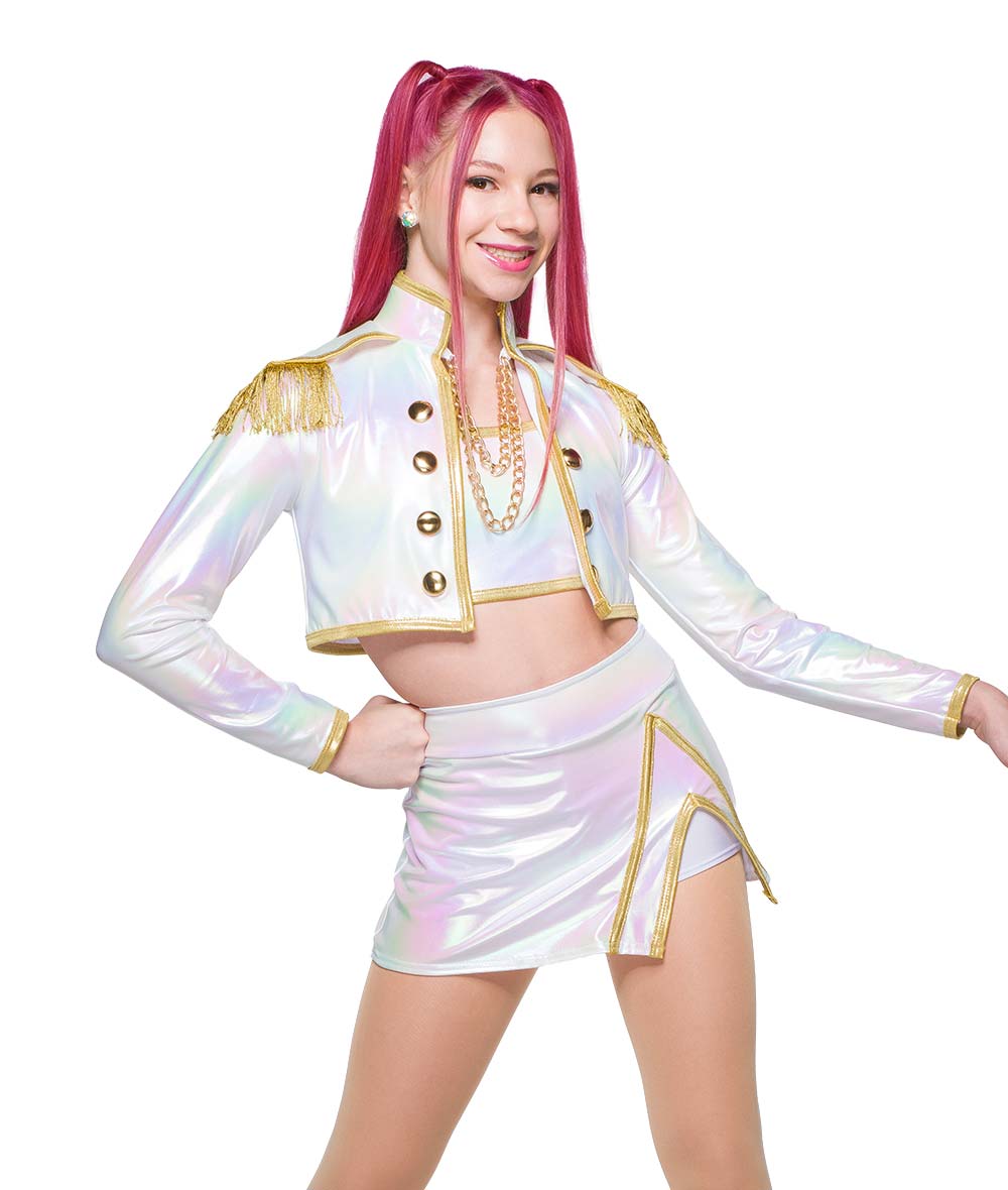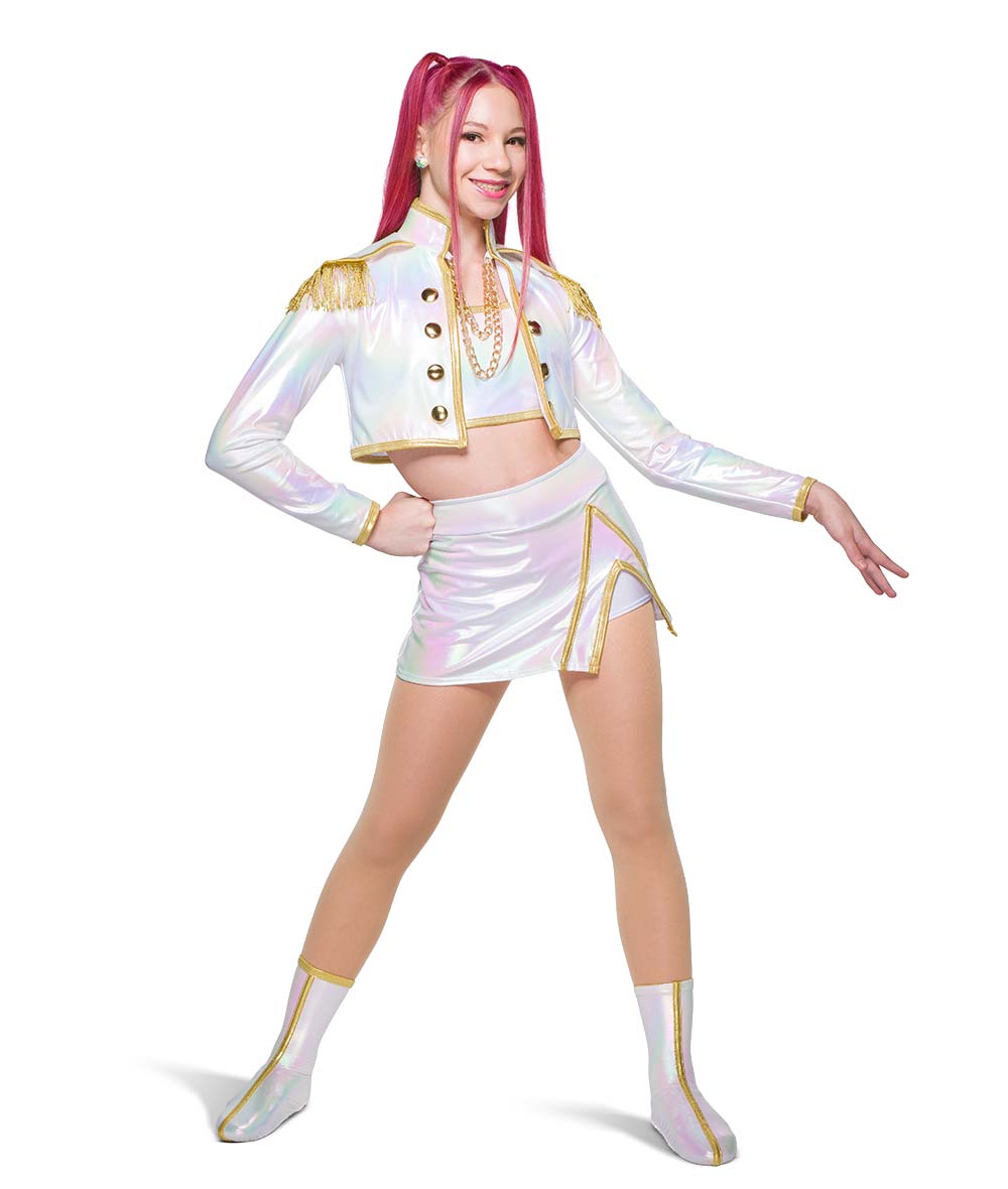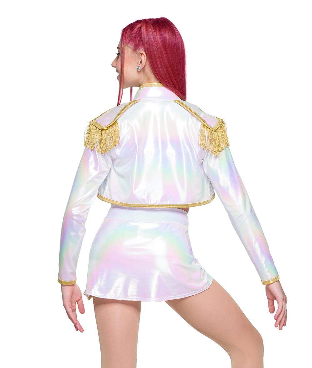 Hologram foil lycra jacket, cami and skort with foil lycra trim. Attached gold chains, fringe and tack button details. Made in the USA. Boot covers sold separately.