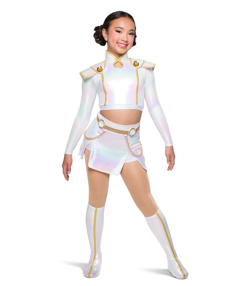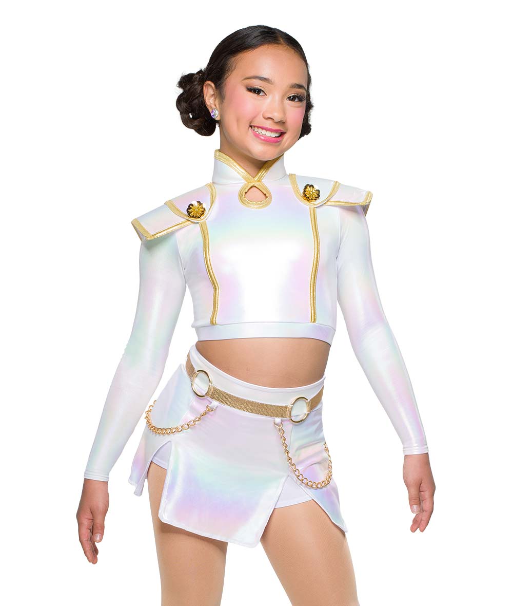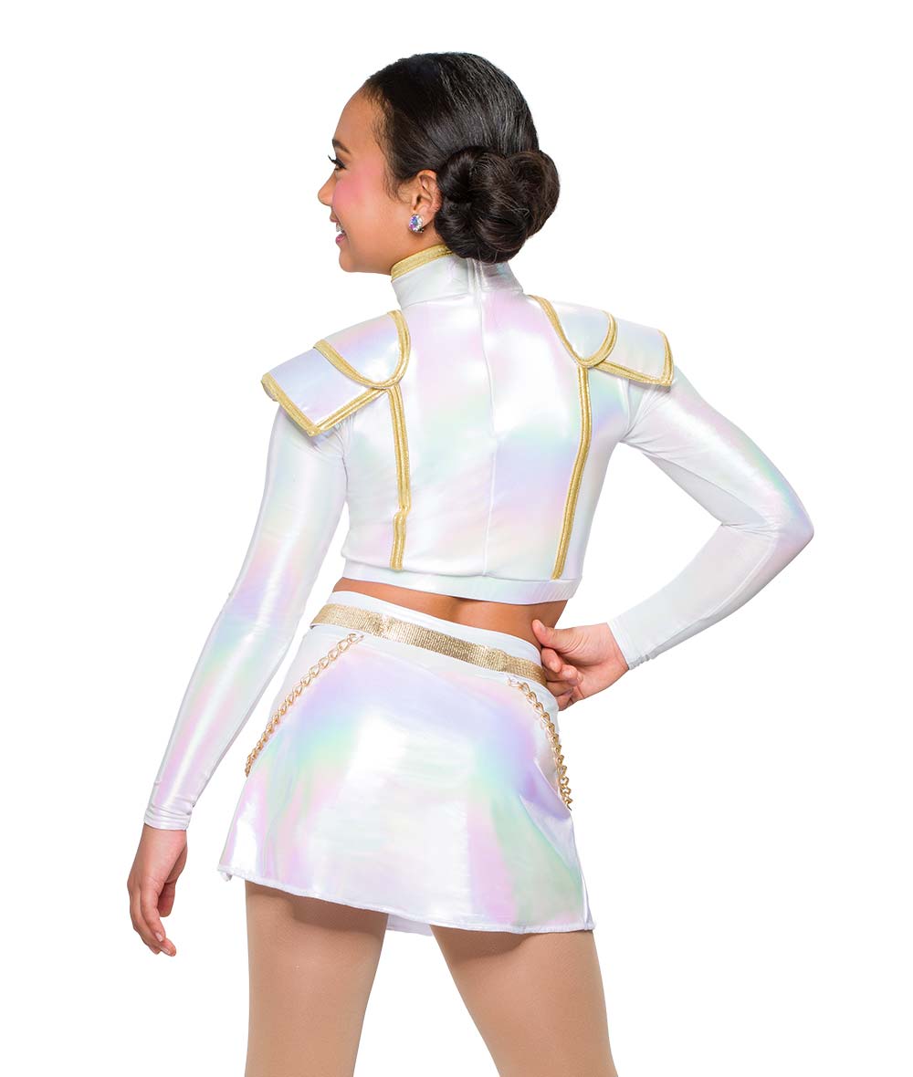 Hologram foil lycra top and skort with foil lycra trim, gold circle appliques and gold chains. Zipper closure on top. Boot covers sold separately. Made in the USA.