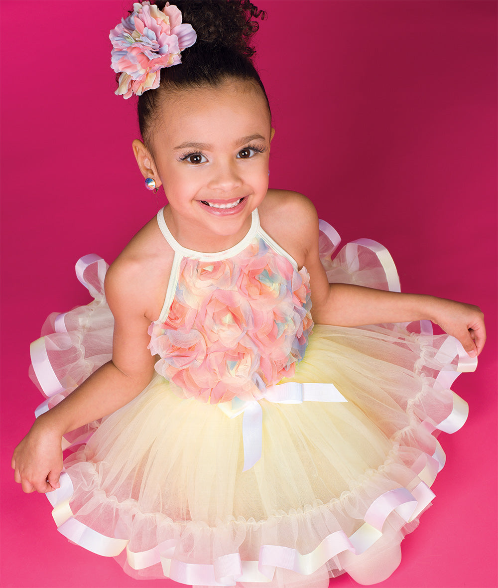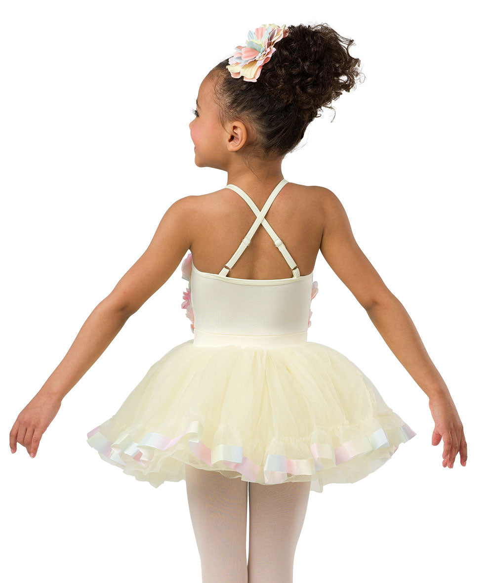 Lined rainbow rosette mesh and spandex leotard with attached rainbow ribbon trimmed organza skirt. Attached adjustable straps. Satin shoe bows sold separately. Imported.