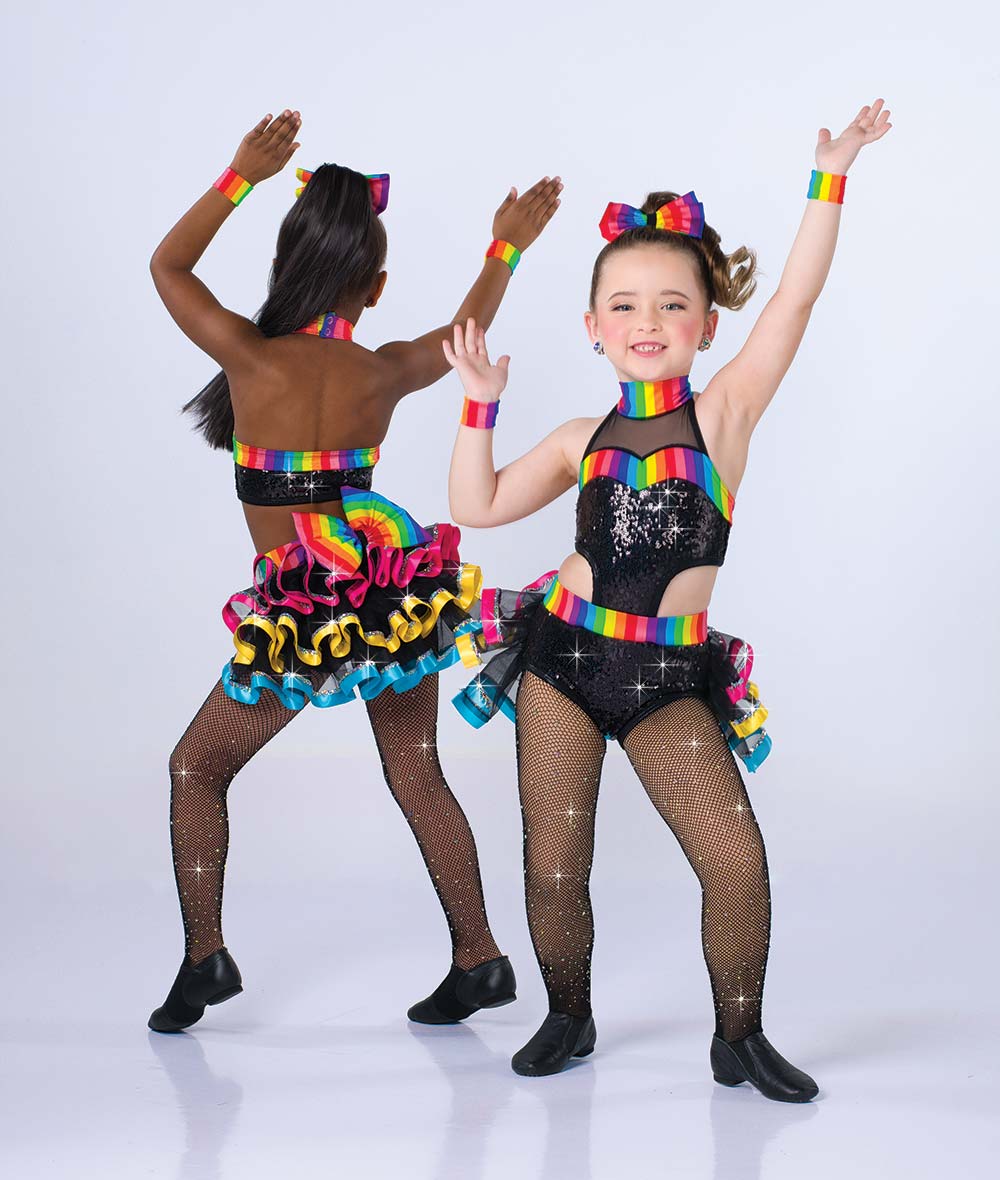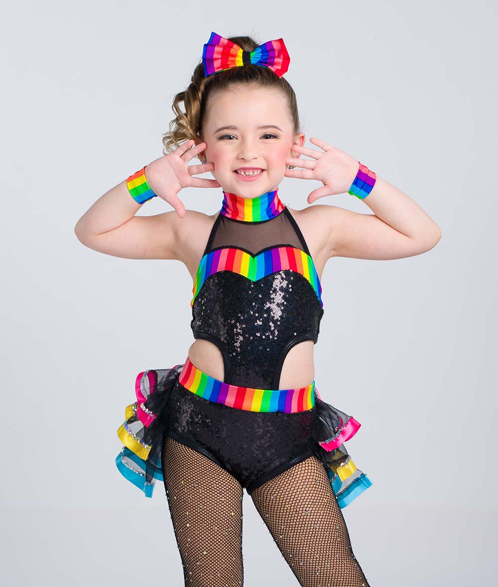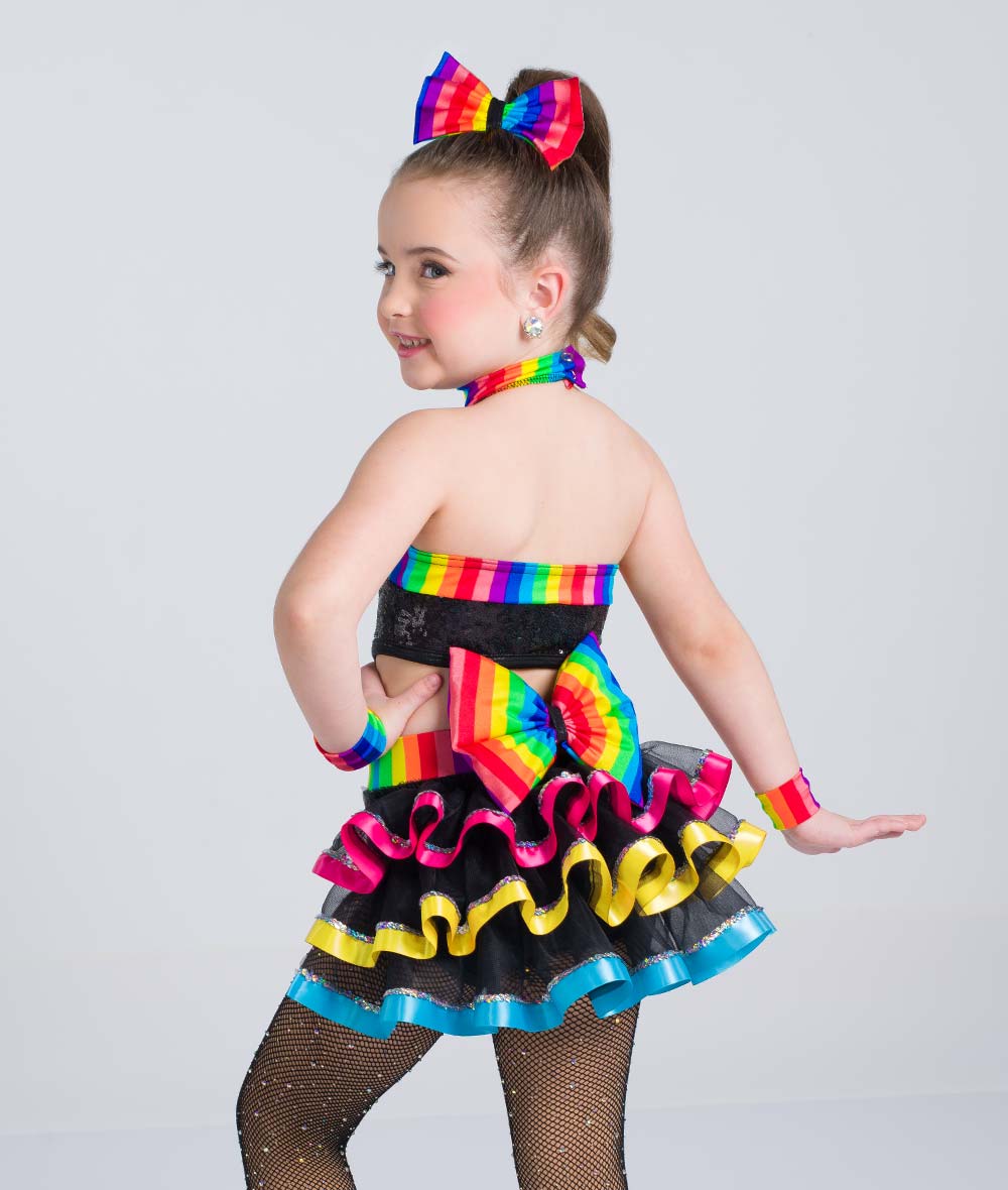 Lined elite sequin and rainbow striped spandex leotard with twirl panty and cutout midriff. Attached ribbon and sequin trimmed organza back bustle with removable bow on bar pins. Made in the USA.