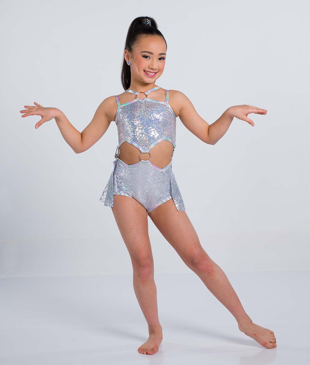 Lined elite sequin spandex leotard with midriff cutouts, backskirt, and twirl panty. Attached O-rings and foil lycra trim. Made in the USA.